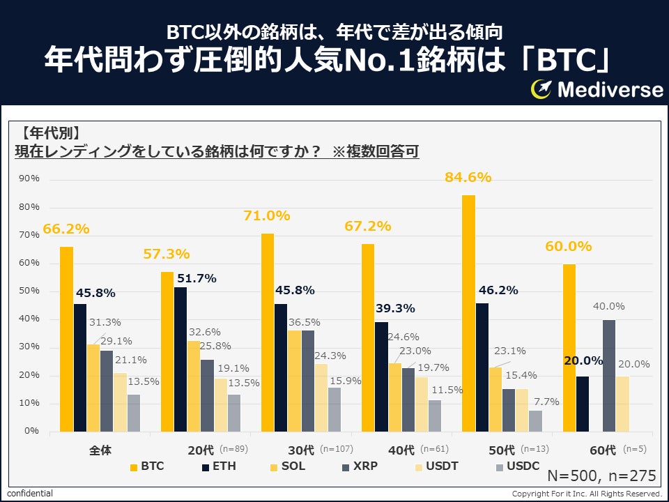 男女とも「BTC」が首位であり、「BTC」のみ男性が女性を上回っていたが、「ETH」「SOL」などその他の銘柄に関しては、いずれも女性の利用率が男性より高いことが垣間見える。