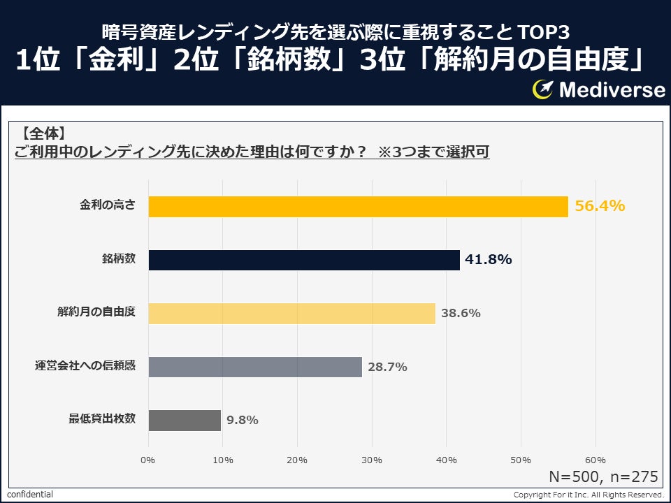暗号資産におけるレンディング先の決め手は? 3位「解約月の自由度」2位「銘柄数」1位は?