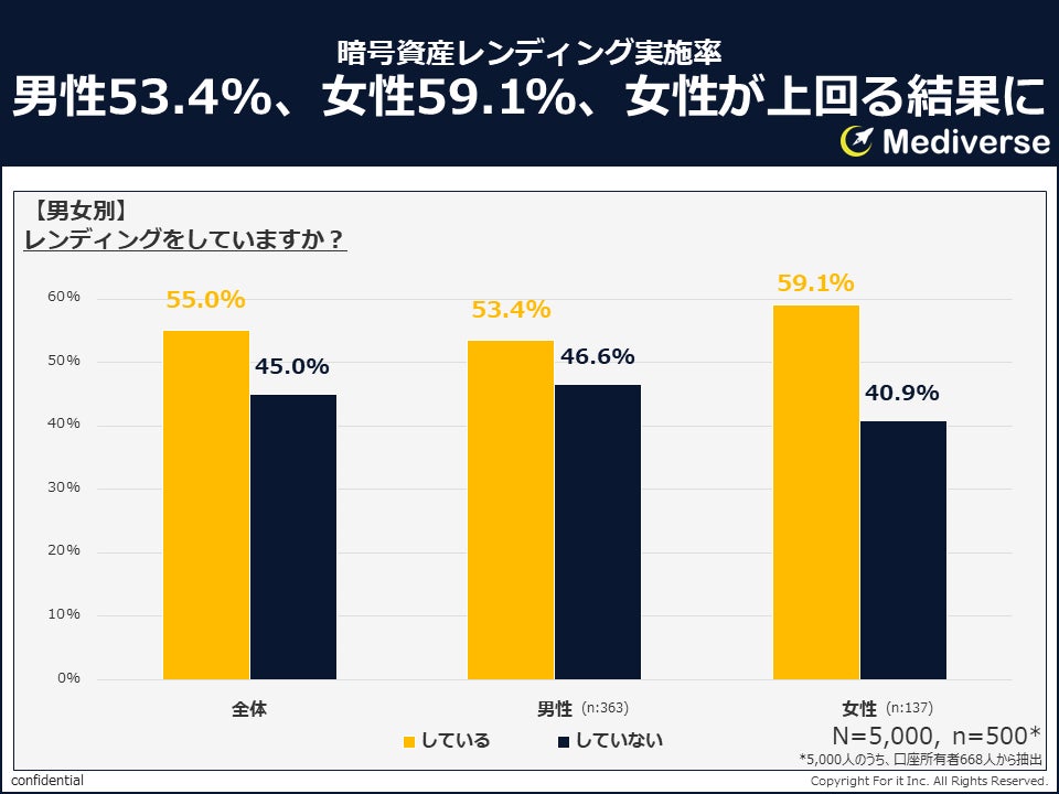 今回のアンケート調査結果では、暗号資産レンディングは暗号資産口座(仮想通貨口座)保有者の半数以上がすでに実施しており、その実施率・銘柄選定・レンディング先において重視するポイントには、性別・年代・世帯年収によって、明確な差異があることが判明いたしました。