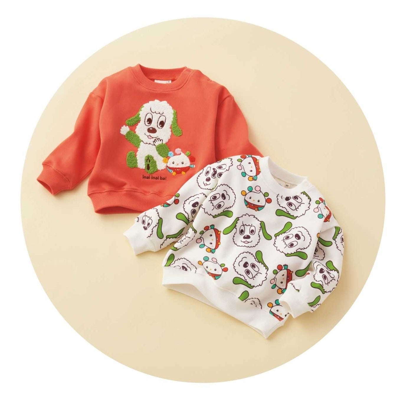 仲良しな「ワンワン」・「ぽぅぽ」がデザインのトレーナー。肩はスナップボタン仕様なのでお着替えしやすいです。