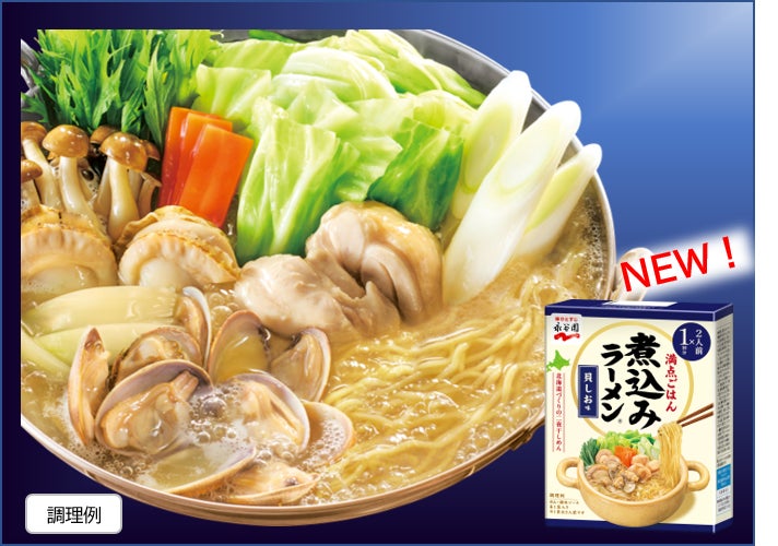定番のしょうゆ味に加え、少し大人な味わいの貝しお味をご用意しています。手軽に肉も野菜もたっぷり食べられる煮込みラーメンで、団らんの時間をぜひお楽しみください!