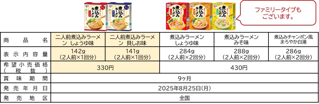 株式会社 永谷園(社長:掛谷 浩志、東京都港区)は、長年ご愛顧いただいている「煮込みラーメン」の新たなラインナップとして、「二人前 煮込みラーメン® しょうゆ味」「同 貝しお味」を2025年8月25日(月)より全国で新発売いたします(希望小売価格・税抜330円) 。