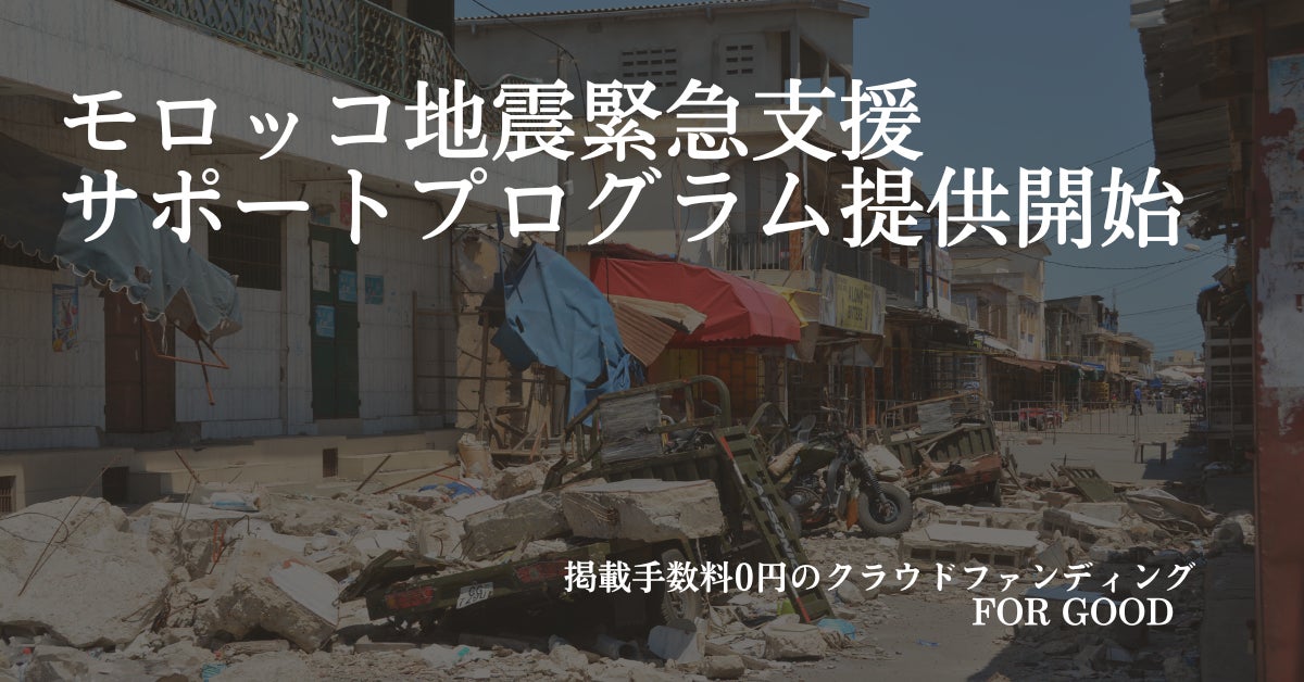 株式会社ボーダレス・ジャパン(代表取締役:田口一成/本社:東京都新宿区)が運営するソーシャルグッドに特化したクラウドファンディングサービス「For Good」では、北アフリカのモロッコ中部マラケシュ近郊を震源に8日発生した地震を受け、緊急支援に取り組む非営利団体・企業・個人向けにクラウドファンディング緊急支援サポートプログラムの提供を開始します。