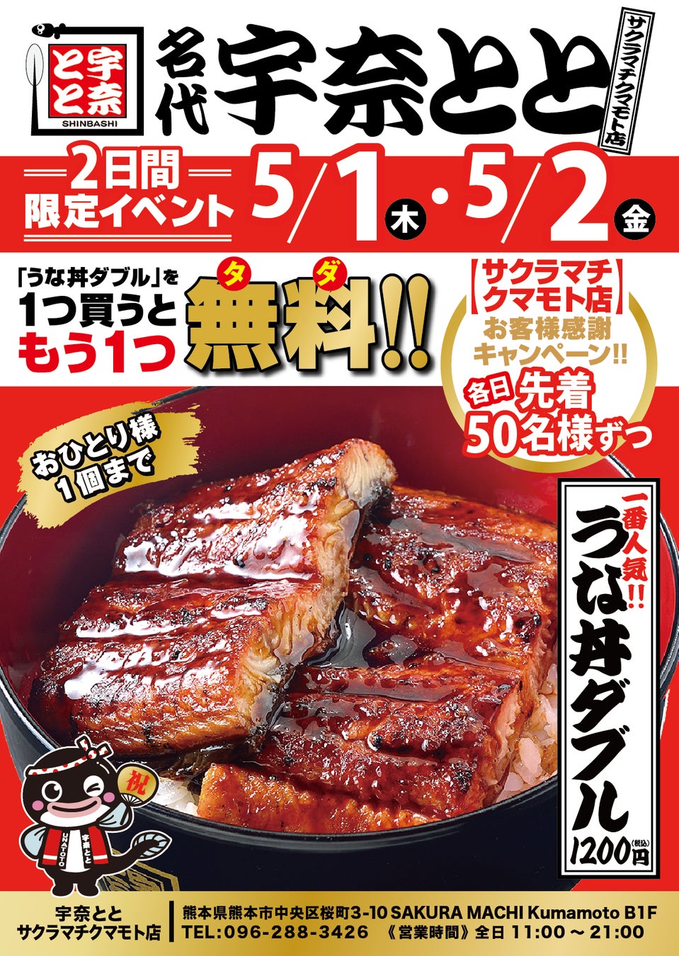 名代 宇奈ととサクラマチクマモト店が5月1日にリニューアル!「うな丼ダブル」を1つ買うと1つ無料に!