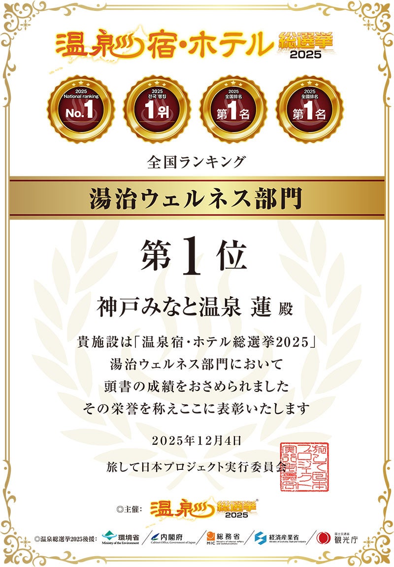 【神戸みなと温泉 蓮】5省庁(環境省、内閣府、総務省、経済産業省、観光庁)後援の「温泉宿・ホテル総選挙2025」で4年連続全国1位を獲得