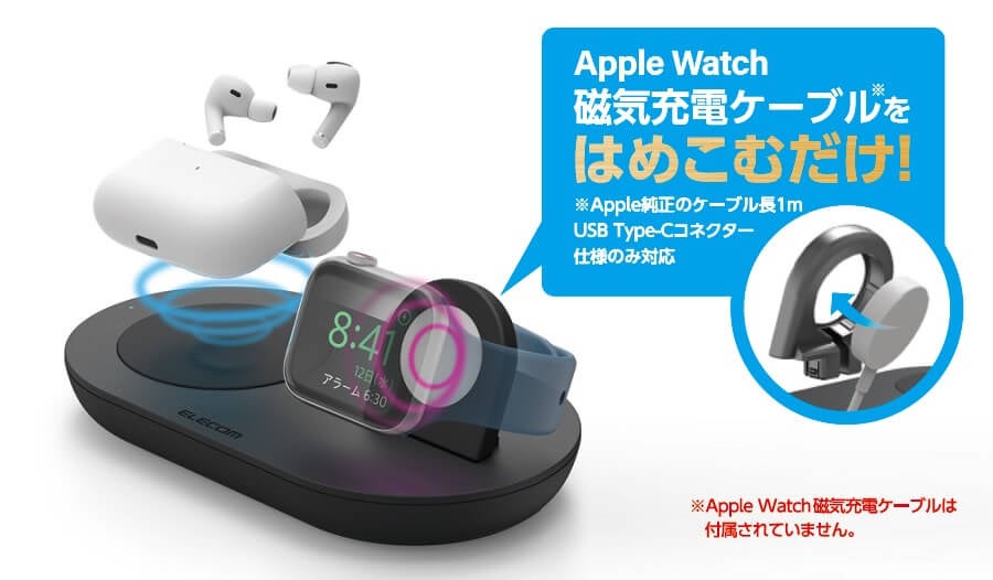 本製品にはApple Watch磁気充電ケーブルは付属しておりません。Apple Watchを充電いただくにはケーブル長100cm、USB-C(TM)タイプのApple純正Apple Watch磁気充電ケーブルを別途ご用意ください。