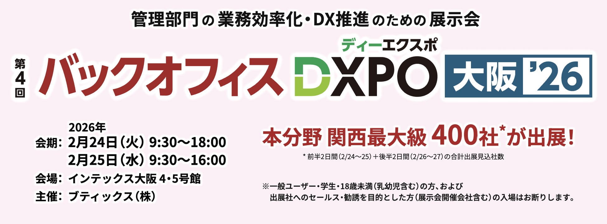 第4回バックオフィスDXPO 大阪'26は、総務・人事・経理などの管理部門を対象とした業務効率化やDX推進のための専門展です。