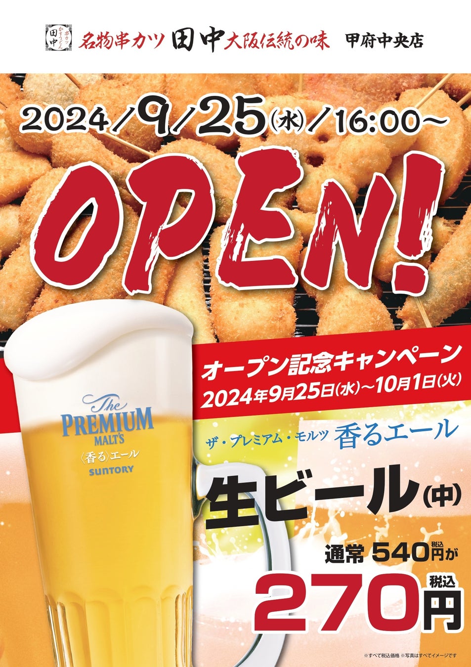 山梨県初出店!『串カツ田中 甲府中央店』が9月25日(水)にオープン!オープン記念キャンペーンで【生ビール270円!】