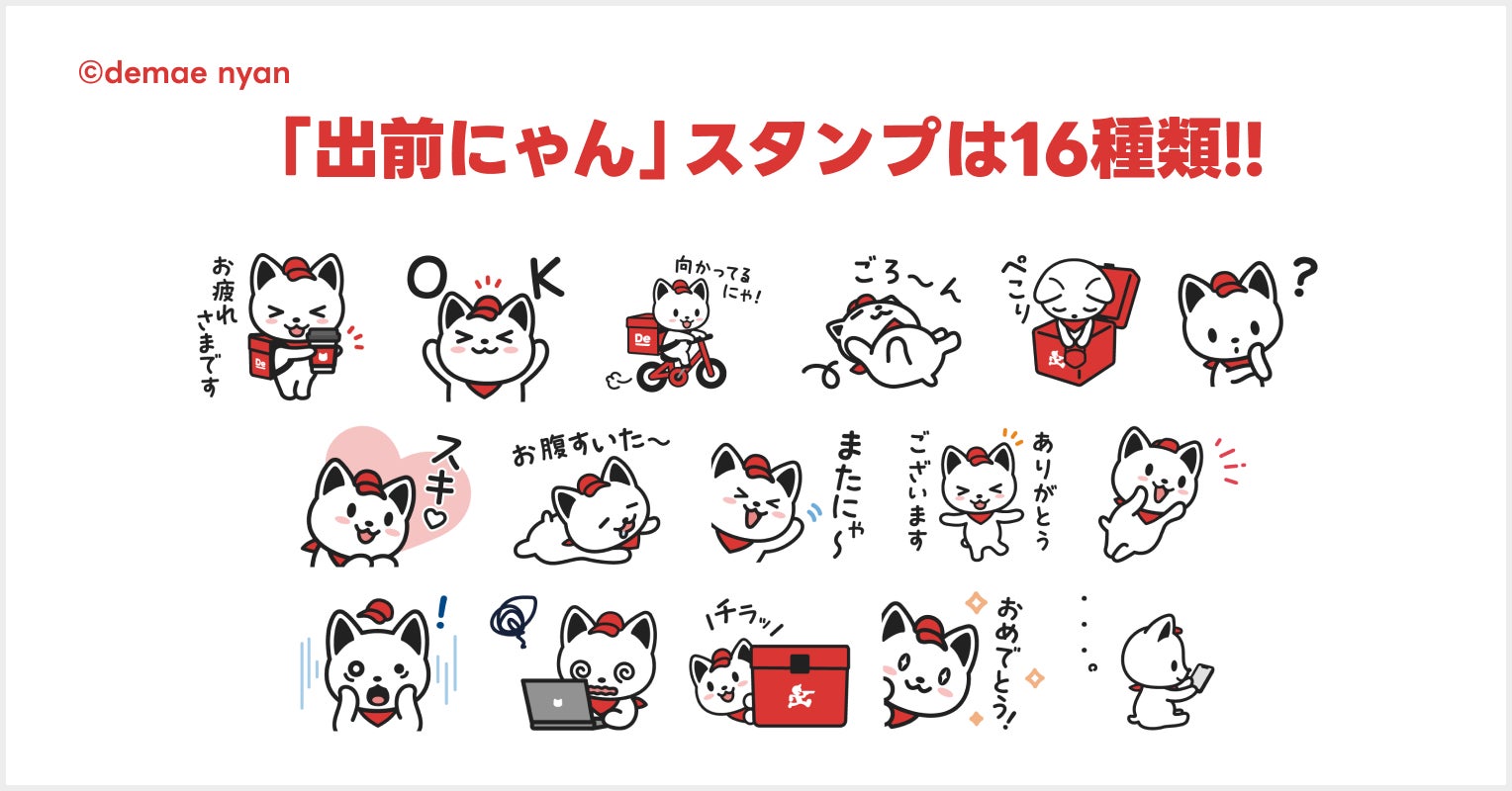 今回配信するLINEスタンプは、日常で使いやすい16種類の「出前にゃん」が登場し、表情豊かな愛らしい姿でLINEメッセージを彩ります。出前館公式LINEアカウントを友だち追加することでダウンロードいただけますので、ご家族や友人とのコミュニケーションにぜひご活用ください。