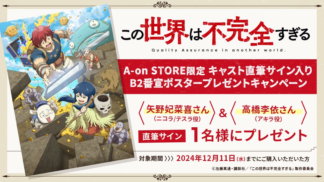 A-on STOREにて『この世界は不完全すぎる』Blu-ray BOXをご購入いただいた方の中から、抽選で1名様にキャスト直筆サイン入りB2番宣ポスターをプレゼントするキャンペーンを実施中です。