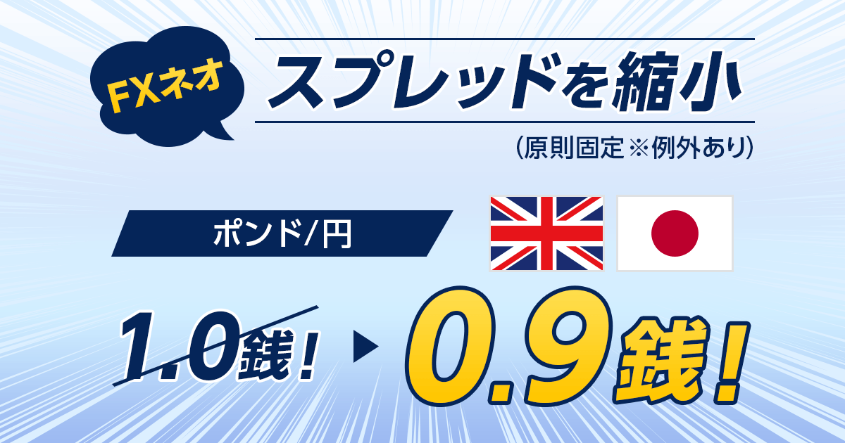 GMOインターネットグループのGMOフィナンシャルホールディングス株式会社の連結会社で、金融商品取引業を営むGMOクリック証券株式会社(本社:東京都渋谷区、代表取締役社長:鬼頭 弘泰、以下:当社)は、2022年8月1日(月)午前7時より、店頭外国為替証拠金取引「FXネオ」におけるポンド/円の通常スプレッドを1.0銭から0.9銭に縮小しましたので、お知らせいたします。