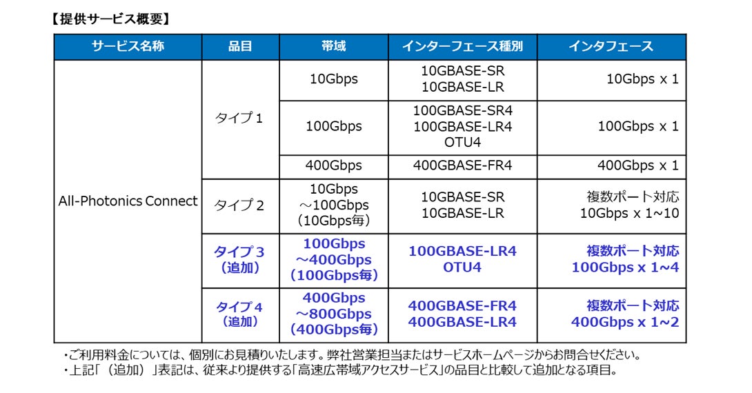 ・APN IOWN1.0を含む高速広帯域アクセスサービスとしてご提供してきたタイプ1およびタイプ2に、新たにタイプ3およびタイプ4を追加して、APNサービス「All-Photonics Connect」として提供開始します。