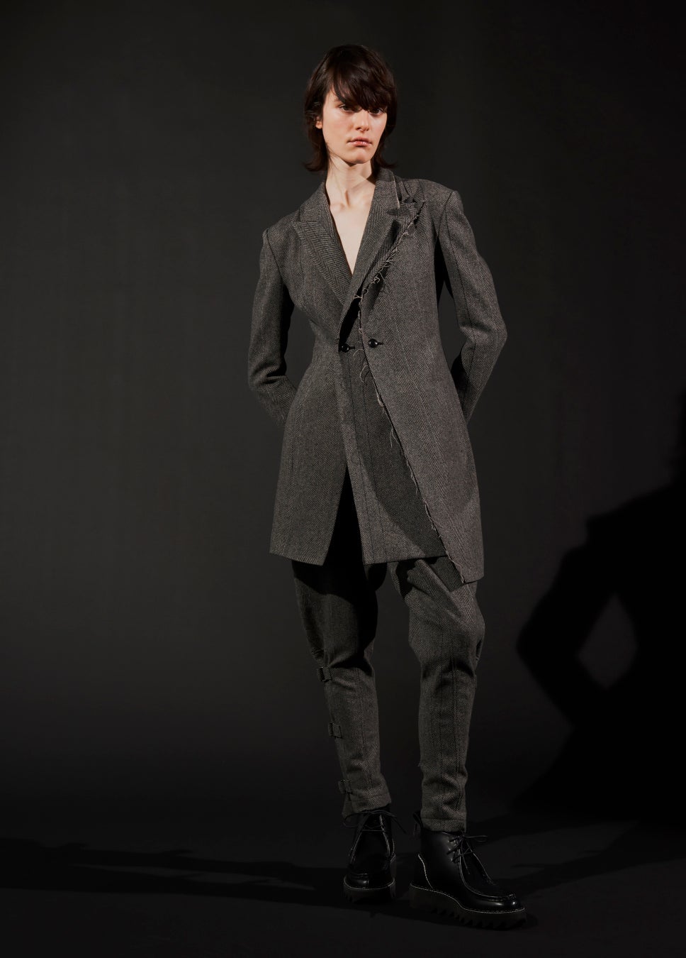 左のフロントが二重になり、もう一枚ジャケットを重ねたように仕立てられたジャケット。襟元は2枚のテーラーカラーが重なり、ずらした身頃がアンバランスなシルエットをつくる。ヘリンボン生地、テーラードなど、紳士服を象徴する要素で構成された優美なシルエット。断ち切りや素材感で、雑で勢いのある風合いを感じる一方、重ねられた見頃が装飾性を生み柔らかに華やかさのあるジャケットスタイル。