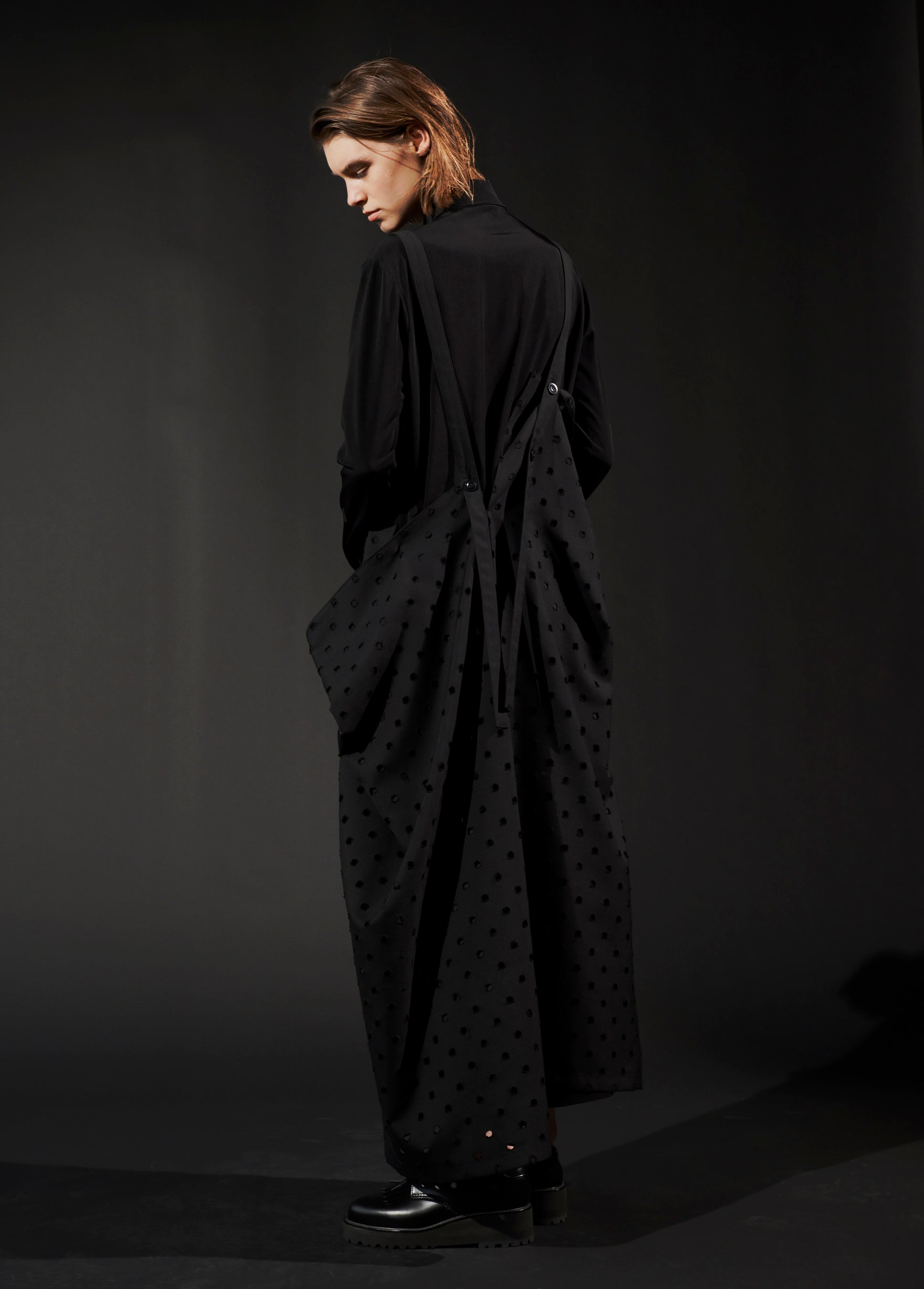 断ち切りで揺れる服地が、優美な崩れたラインを描く。工業素材用のパンチング機で、ドットパンチング加工が施されたT/Wギャバジンでつくられたコート。ところどころ抜け切らないドットがあり、アナログとハイテクを行き来するような表現は、クラシックで新しい。抜けたドットの陰影が、興味深い黒の表情をつくる。