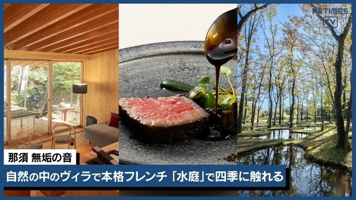 「那須 無垢の音」は、「息吹の森に、こころをほどく。」をコンセプトに、35,000㎡を超える広大な自然の中で宿泊できる施設です。季節ごとに変化を見せる那須の美しい自然の中で、季節の食材や地元の味覚を取り入れたフレンチを満喫できるオーベルジュです。敷地内には、建築家・石上純也氏が手がけた「水庭」や、千葉拓海氏がシェフを務める、那須の豊かな自然の中で育まれた食材を中心としたフレンチスタイルの食事を提供するレストランを備え、最上級の空間で地産の美食を味わいながら、優雅な寛ぎの時間を堪能できます。