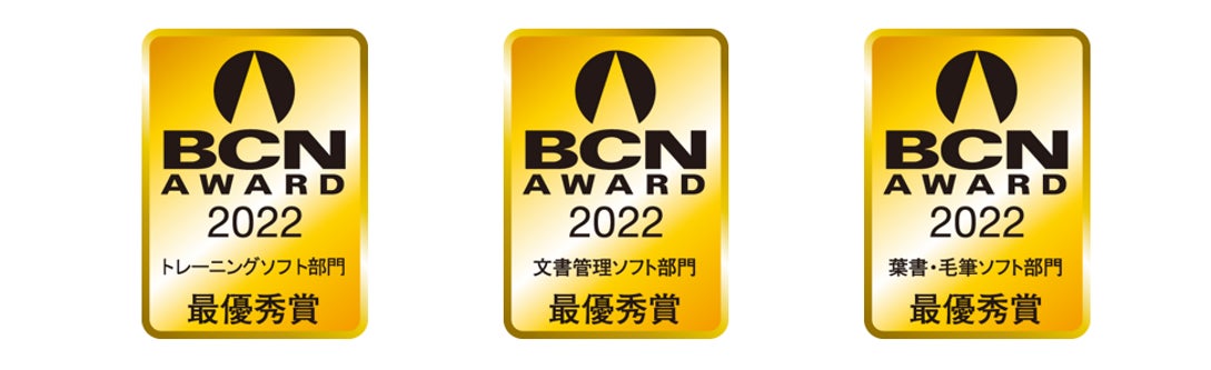 株式会社BCNが主催する「BCN AWARD 2022」において、ソフトウェア24部門中、「トレーニングソフト」、「文書管理ソフト」、「葉書・毛筆ソフト」の3部門で最優秀賞を受賞いたしました。同アワードは、BCN社が集計する全国の主要家電量販店、パソコン専門店、ネットショップの実売データもとに、年間販売数累計第1位のメーカーを表彰する制度です。