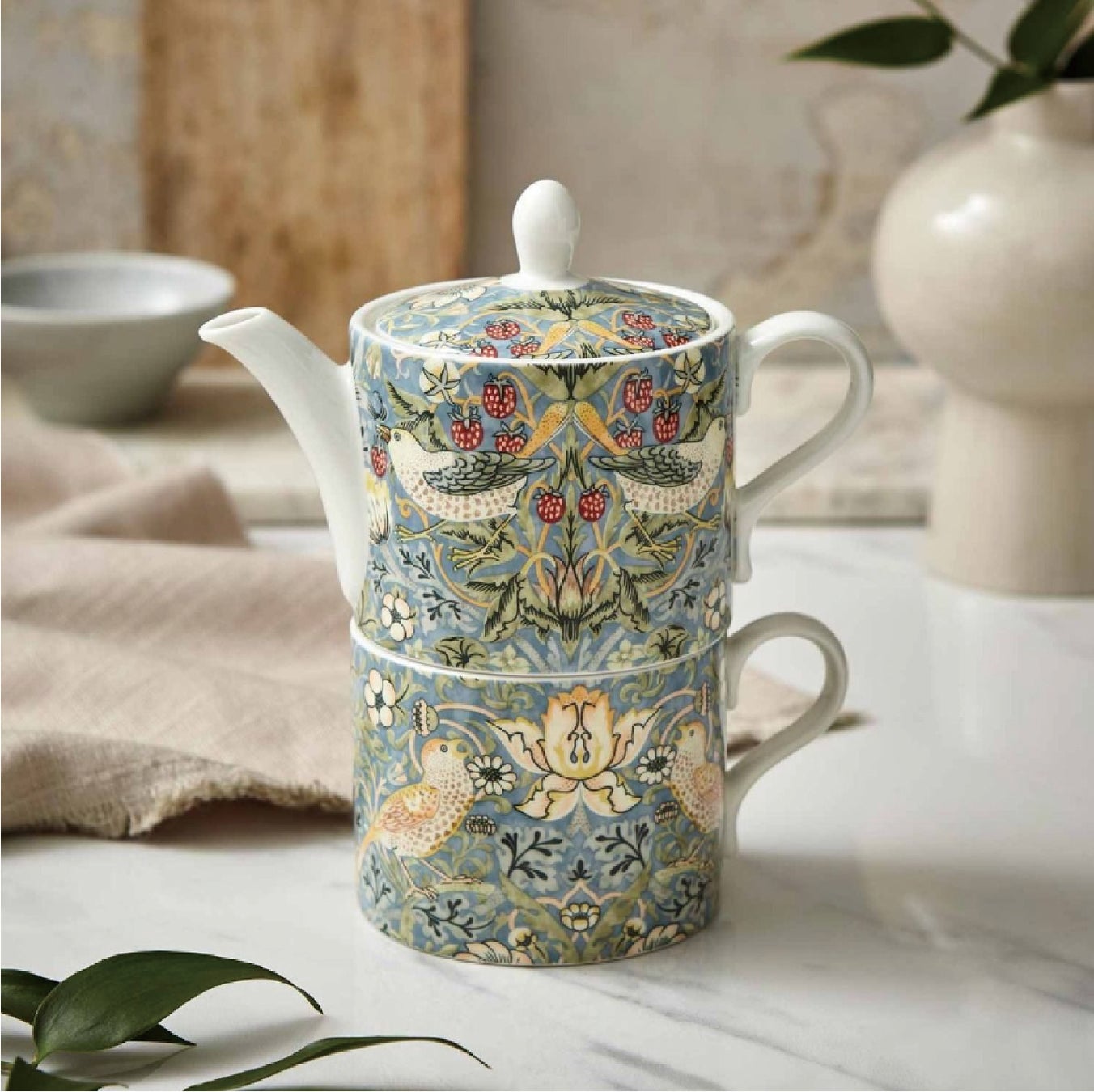 ウィリアム・モリスのいちごどろぼうのデザインが描かれたポットとカップです。