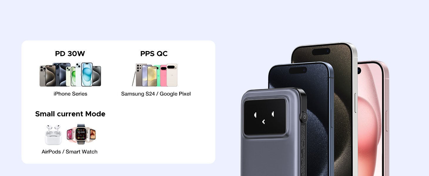 1000種類を超える幅広いデバイスに対応。iPhone 16など最新機器も問題なく使用できます。13層からなる安全保護機能を搭載。しかも、飛行機内持ち込みOK。トリクル充電モードで電力浪費を防止。