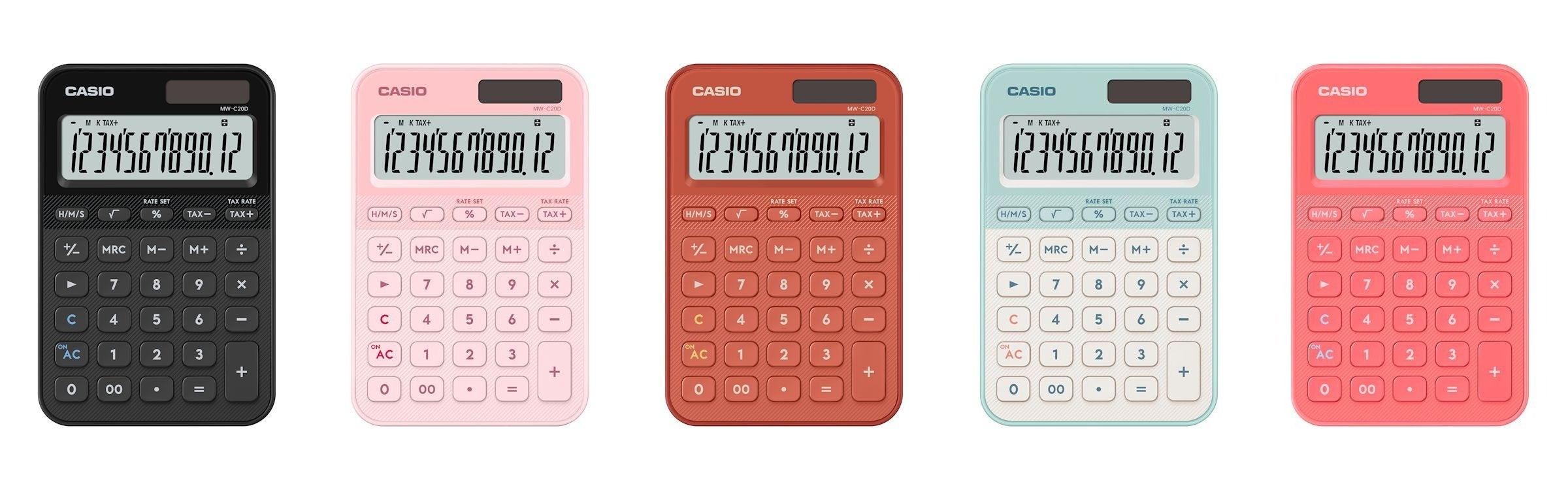 モノトーン、パステル、スモーキーなどの幅広いカラーを揃え、カジュアルな日常使いやビジネスシーンにも使えるツートーンカラーの電卓です。ラウンド形状のシンプルなデザインで手持ちでも使いやすいミニジャストタイプ『MW-C20D』(10色)と、ポケットに入れやすい手帳タイプ『SL-300D』(5色)を用意しました。自分のスタイルや用途に合わせて多様なカラーから選択できます。