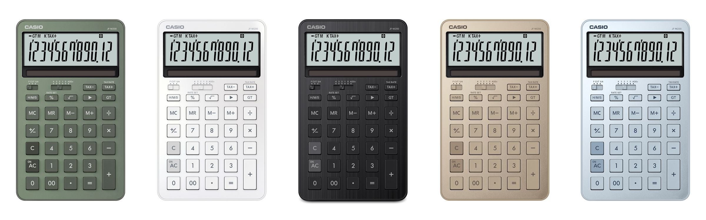 上質で落ち着いた色合いと質感を追求したスリムでスタイリッシュな電卓です。メタル素材のブラックは高級感のあるヘアライン加工を、ブルーとゴールドには上品なブラスト仕上げを施しました。樹脂素材のグリーン、ホワイトは、柔らかな光沢が特長のマットパール調に仕上げています。液晶とソーラー配置を一体化し、表面素材が際立つシンプルなデザインとしました。 また、背面はレイヤー形状により薄型で持ちやすい設計です。ラインアップは、卓上で使いやすいジャストタイプの『JF-M200』(5色)と、携帯しやすいミニジャストタイプの『MS-M200』(5色)を展開。ビジネスシーンからギフト需要まで幅広く活用できます。