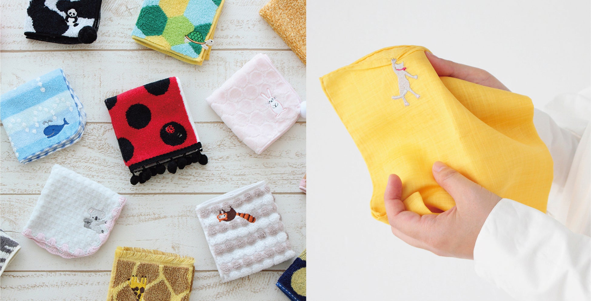 遊び心溢れるデザインのこどもハンカチや、発売以来人気の様々な動物がハンカチの縁を引っ張る刺繍がユニークな「HIKKOMI 」シリーズなどを販売します。