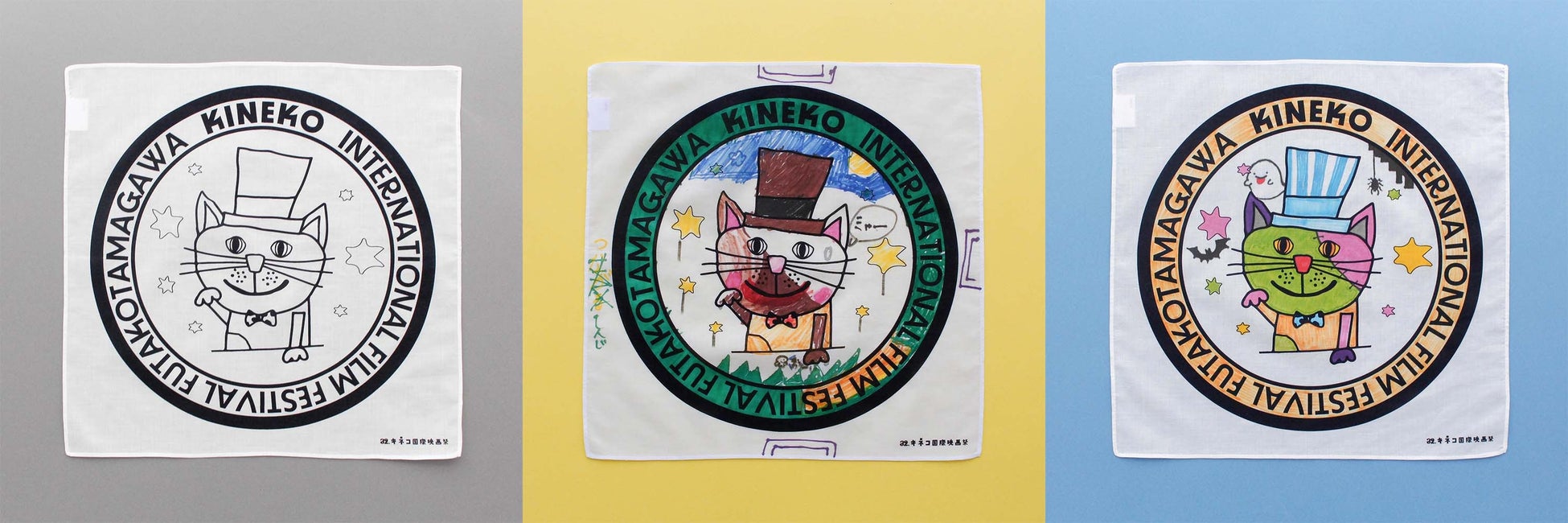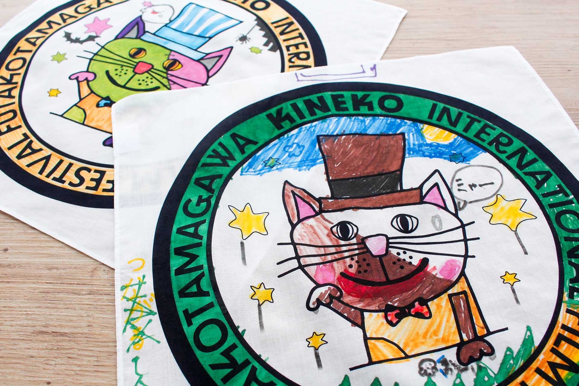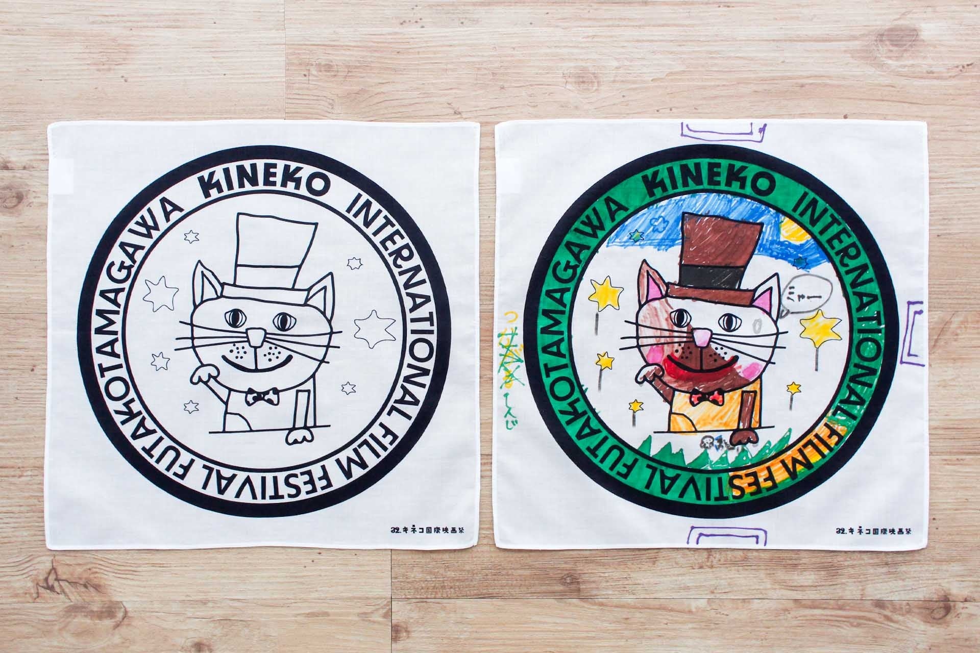 今回のワークショップのためにキネコ国際映画祭オリジナルのハンカチを作成しました。ハンカチの裏面には、名前が書けるネームタグ付き。色を塗ったり絵を描き加えたり。世界にひとつだけのハンカチーフをお作りいただけます。お子様はもちろん大人もお楽しみいただけます。