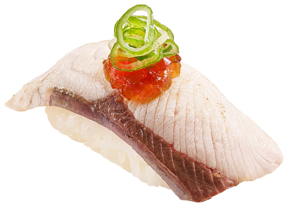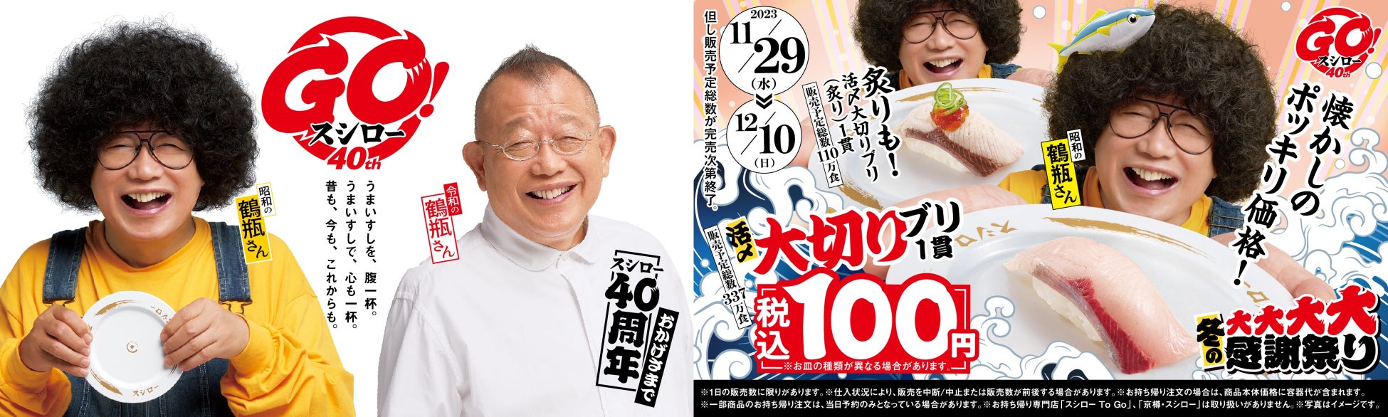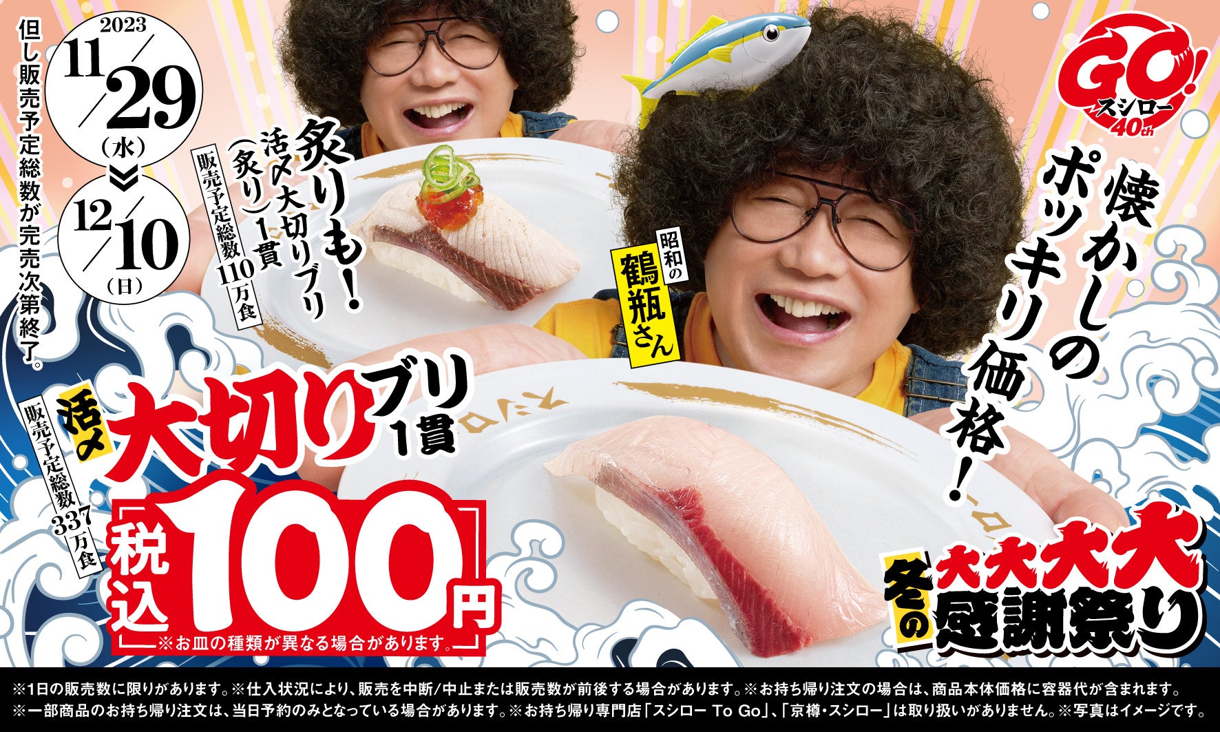 11月29日(水)からは、三重や九州などで2年以上かけて育てられたブリを、店内で大切りにした「活〆大切りブリ」と、提供前に炙ってジュレポン酢をトッピングした「活〆大切りブリ(炙り)」を全店で“税込100円”でご提供いたします。鮮度抜群のブリは、加工場まで生きたまま運ばれ、活〆などの加工をすばやく行っています。店舗には、一度も冷凍せずに皮つきで納品されて、店内で皮引き・切りつけを行っており、身と皮の間の旨みが濃厚な部分をお楽しみいただけます。“うまいすし”を少しでもお手頃にお腹いっぱい召し上がっていただきたい、という想いから仕入れ担当者が全力を尽くし、40周年の記念商品として、全国の皆さまに楽しんでいただけるよう価格帯が異なる都市型店舗・準都市型店舗・郊外型店舗で全店“税込100円”で販売いたします。