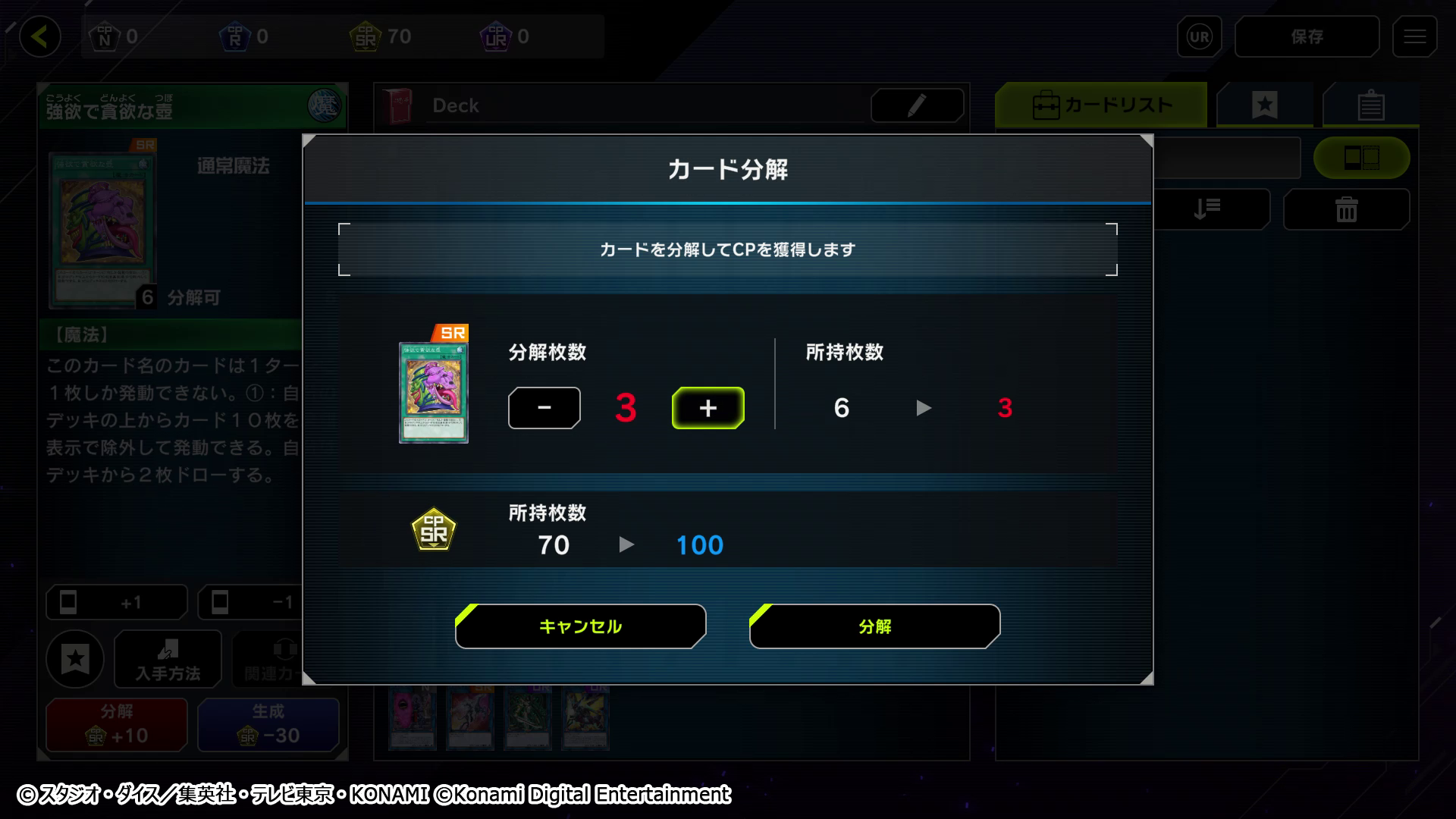 所持しているカードを分解すると分解したカードと同等のレアリティの「CP」を獲得でき、集めた「CP」を消費して新たなカードの生成が可能です。