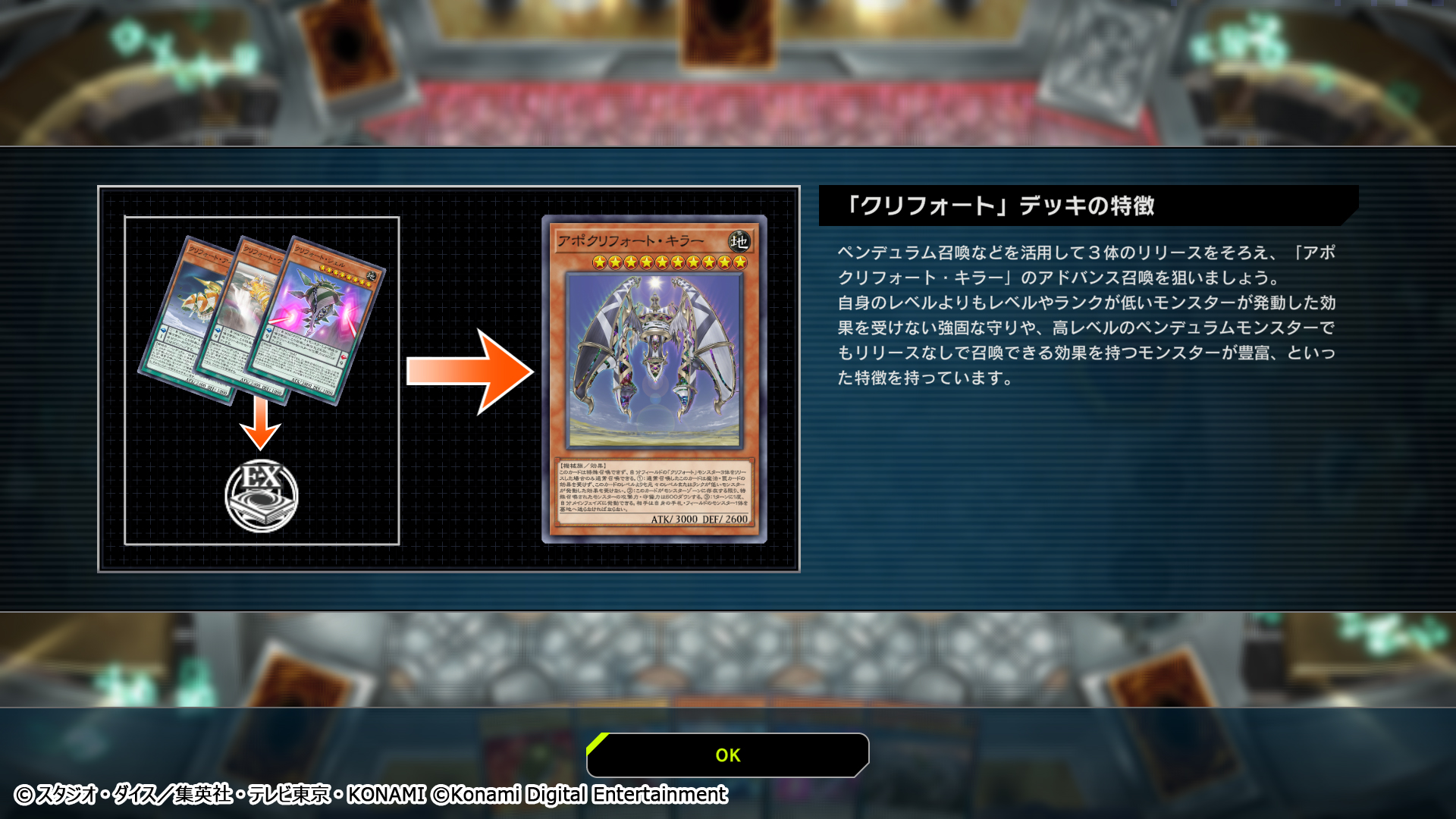 また、遊戯王OCG/TCGのカードを題材としたストーリーを複数お楽しみ頂ける「ソロモード」や「ソロモード」内で遊びながらデュエルを学べる「チュートリアル機能」、「カードデータベース」との連携で世界中のデュエリストの「デッキレシピ」を確認・コピーできる機能、所持しているカードを分解して新たなカードを生成できる「カードクラフト機能」なども搭載しており、遊戯王カードゲームをデジタルで存分に楽しむことが可能です。