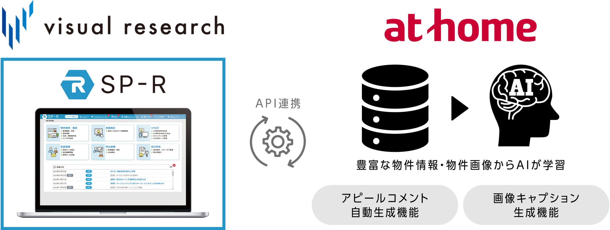 この度、ビジュアルリサーチが開発を手掛ける賃貸仲介システム「SP-R」に、アットホームのアピールコメント自動生成と画像キャプション自動生成機能を提供いたします。