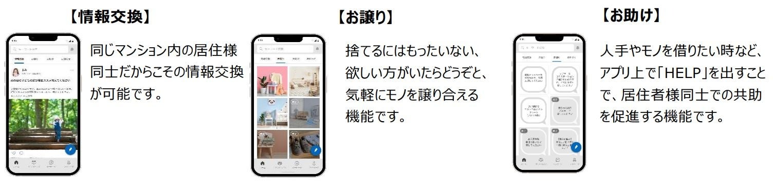 子育て等に関する「情報交換」、ベビーカー等の使用しなくなった子ども用品等の「お譲り」、ちょっとした困りごとに対する「お助け」等、様々な目的に応じて、アプリ上で手軽に居住者様同士のコミュニケーションが可能になり、共助の活性化が期待されます。