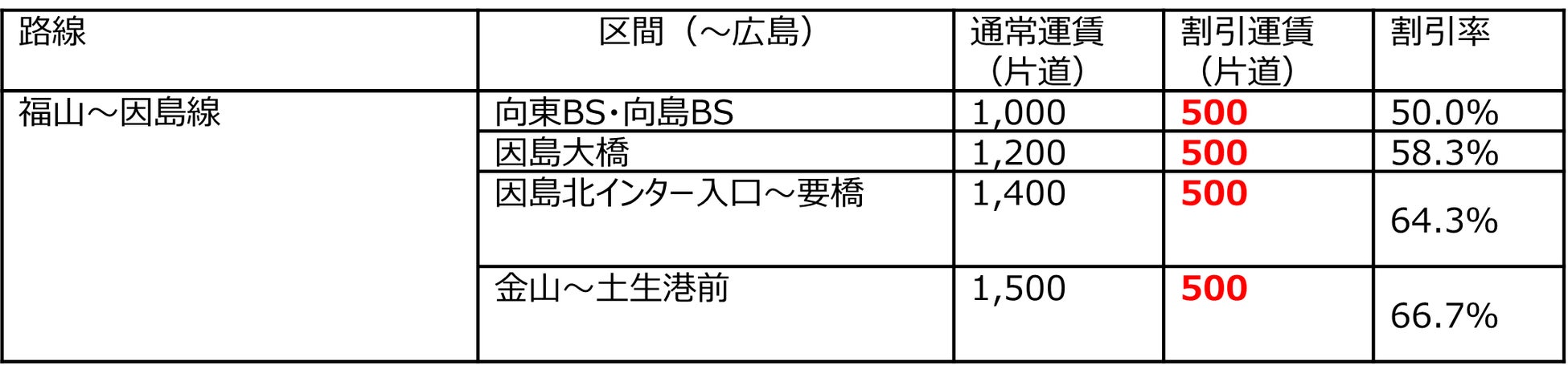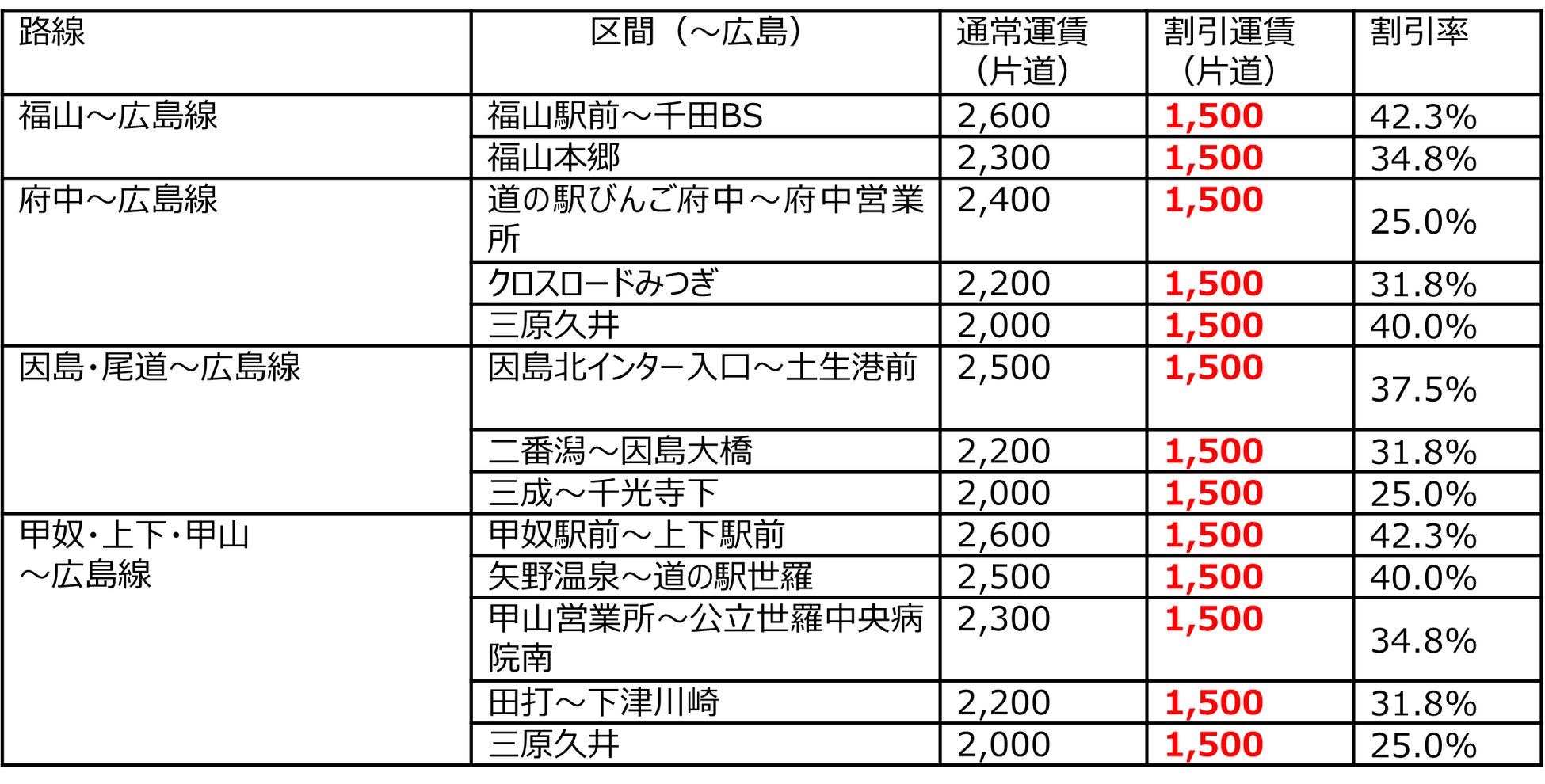 なお、広島市内東部地域を結ぶ路線については7月22日(火)から9月30日(火)の平日*、福山~因島線については7月22日(火)から9月30日(火)*(*いずれの路線もお盆期間中を除く)が対象となります。