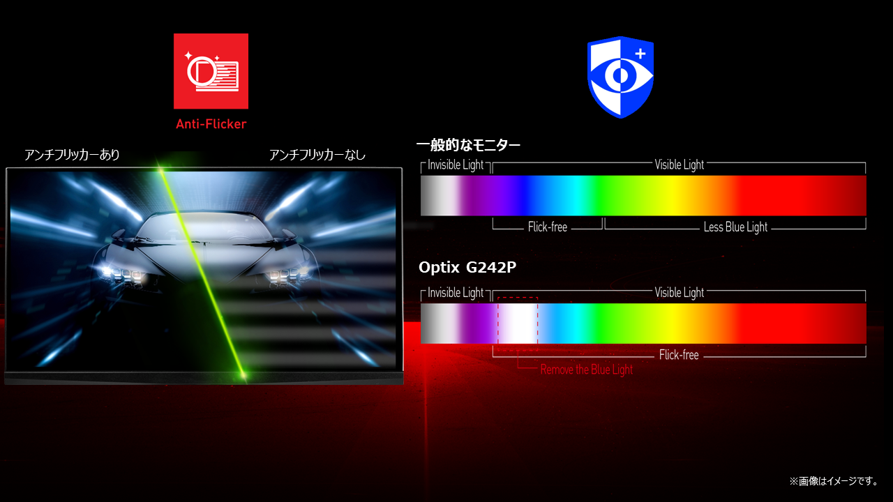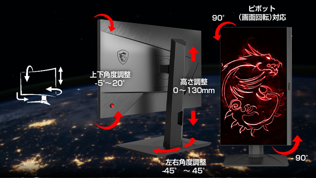「Optix G242P」は丁度よい大きさの23.8インチサイズに高画質・広色域なIPSパネルを採用し、リフレッシュレート144Hz・応答速度1msの高いスペックを誇り、高画質で残像感の少ない映像で快適にゲームプレイを楽しむことが出来ます。さらに、多機能なスタンドを搭載することで高さや角度を調整し最適なポジションで使用することができます。また、同期機能としてFreeSync Premium、暗いシーンでも視認性を上げるナイトビジョン、長時間の使用において目の疲労を軽減するアンチフリッカー、ブルーライトカット機能を搭載しております。入力端子はHDMI 1.4 ×2、DisplayPort 1.2a ×1に対応しており、パソコンとゲーム機など複数の機器を接続し背面のジョイスティックを操作することで簡単に切り替えて使用することができます。