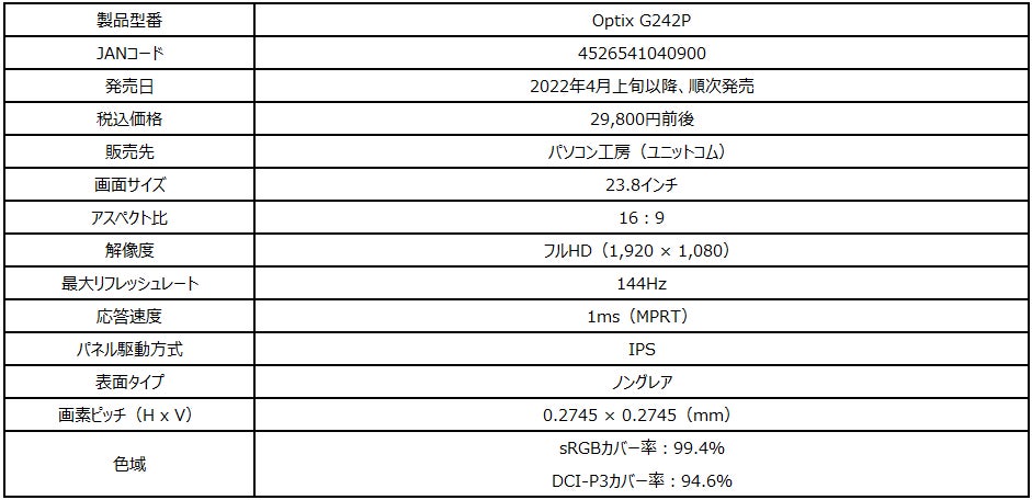高画質IPSパネル搭載ゲーミングモニターに多機能スタンド搭載! 144Hz、1msのスペックで初めてのゲーミングモニターにお勧め ユニットコム限定モデル「Optix G242P」発売