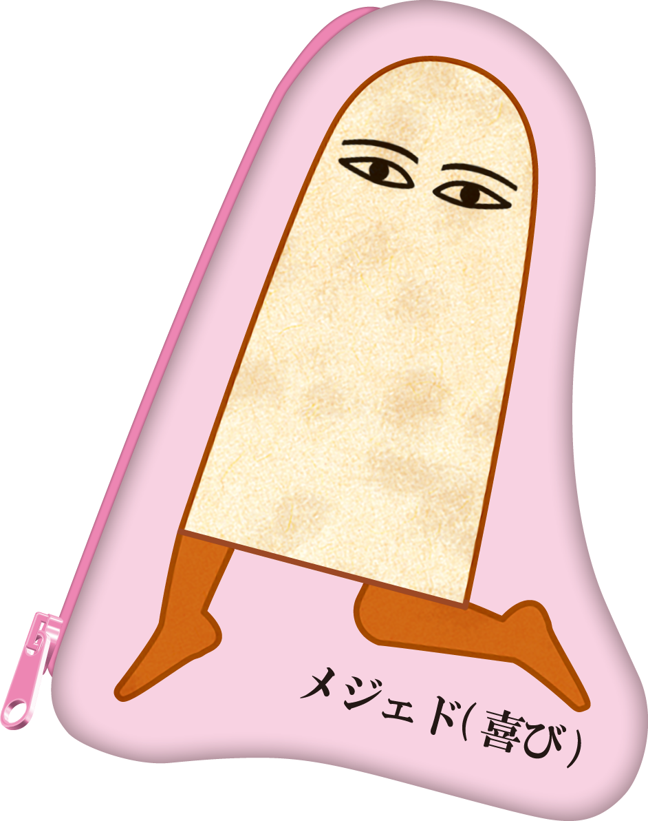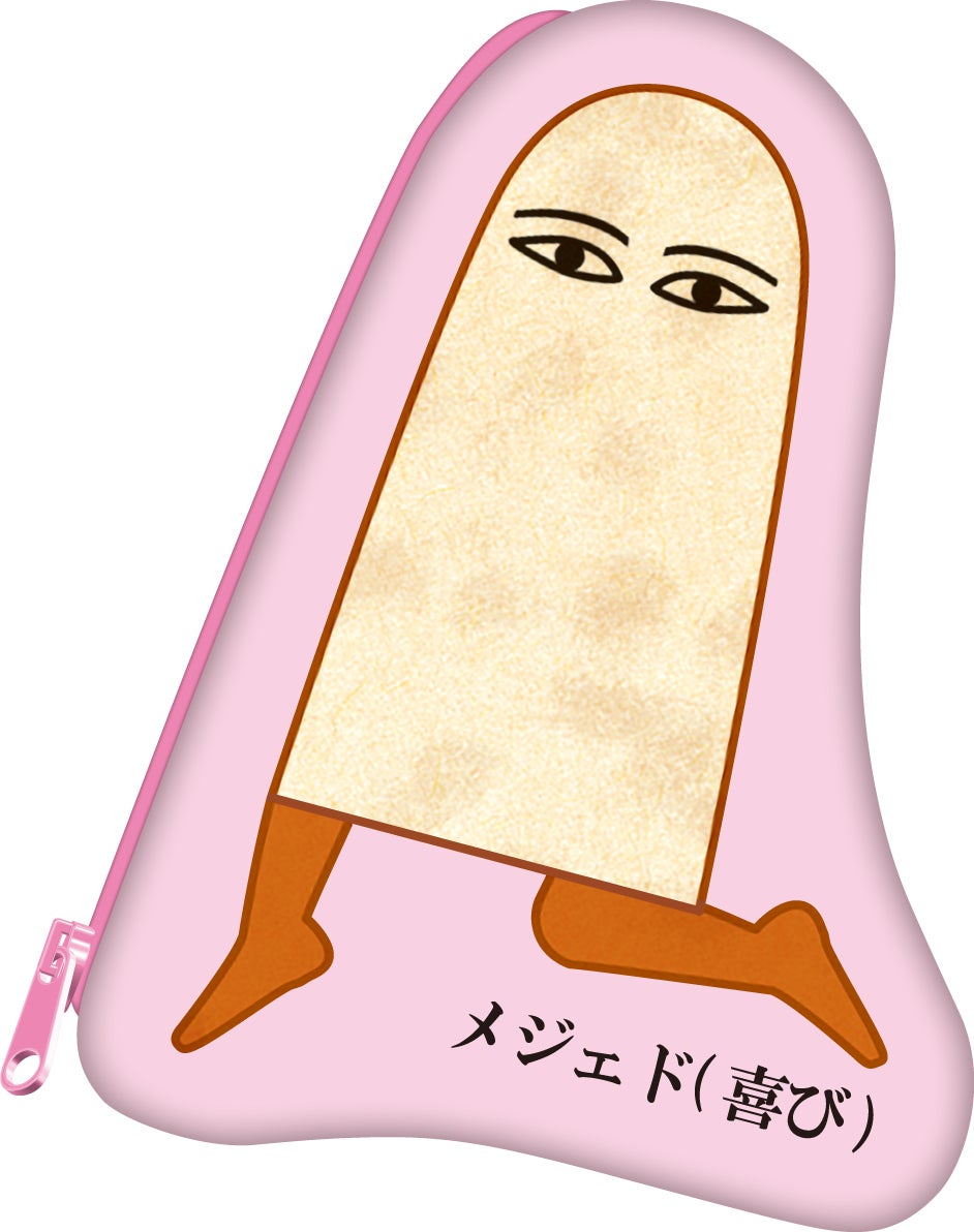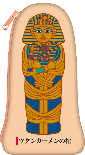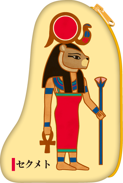 「セクメト」、「メジェド(喜び)」の文房具などが入るポーチ。裏面はカラフルなヒエログリフ柄。