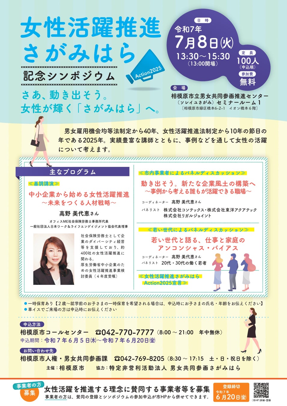 相模原市では、働く女性、これから働こうとする女性、そして女性活躍推進に取り組む企業に対しさまざまな取組を行っています。その一環としてこのたび「女性活躍推進さがみはらAction2025記念シンポジウム」を7月8日(火)に開催します。