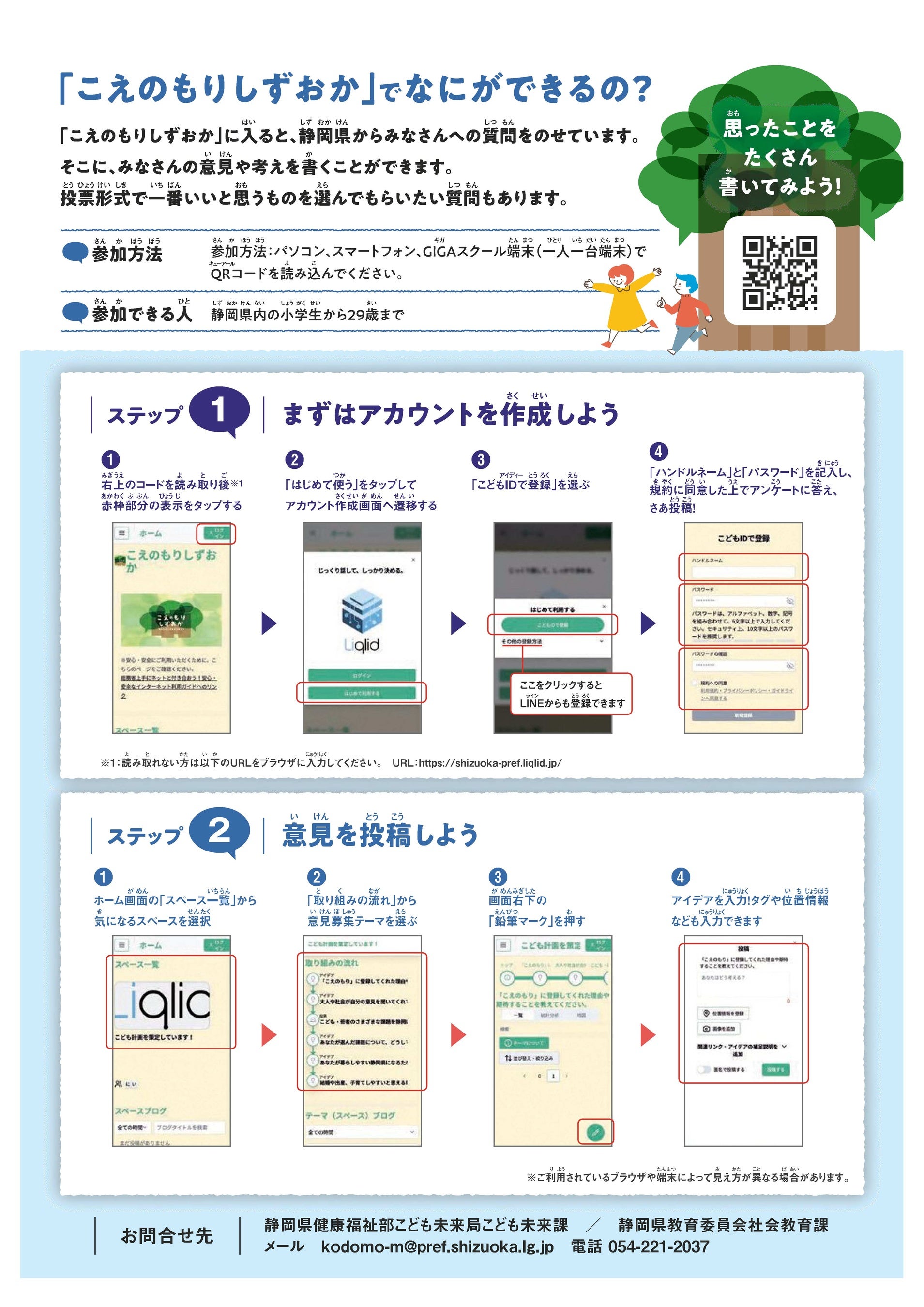 オンラインプラットフォーム「こえのもりしずおか」を開設し、県内のこども・若者のこえをあつめます。