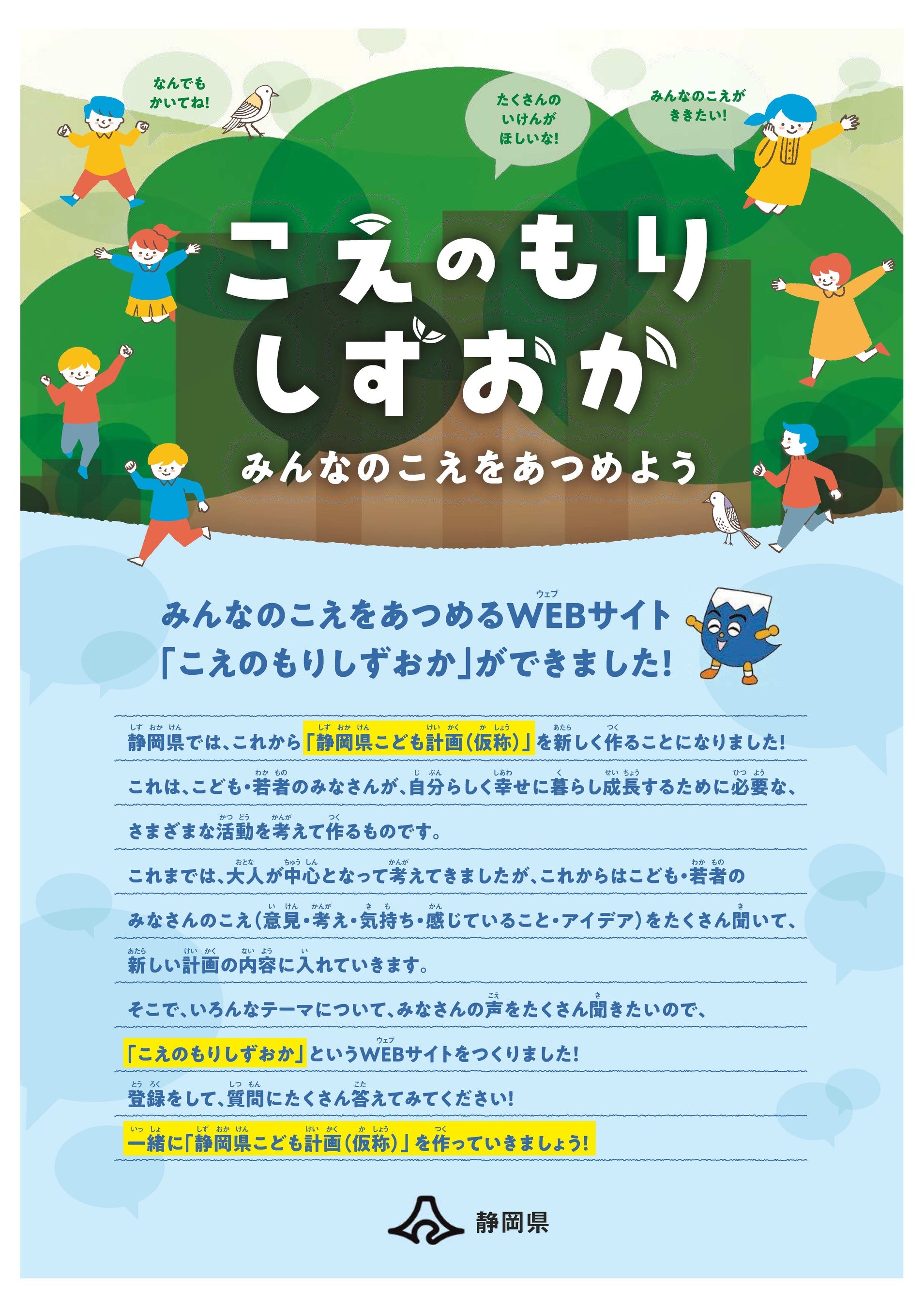 こども基本法に基づき、こども施策を策定し、実施し、及び評価するに当たっては、こども・若者の意見を反映させることが必要なことから、このたび、オンラインプラットフォーム「こえのもりしずおか」を開設し、幅広く県内のこども・若者のこえをあつめます。