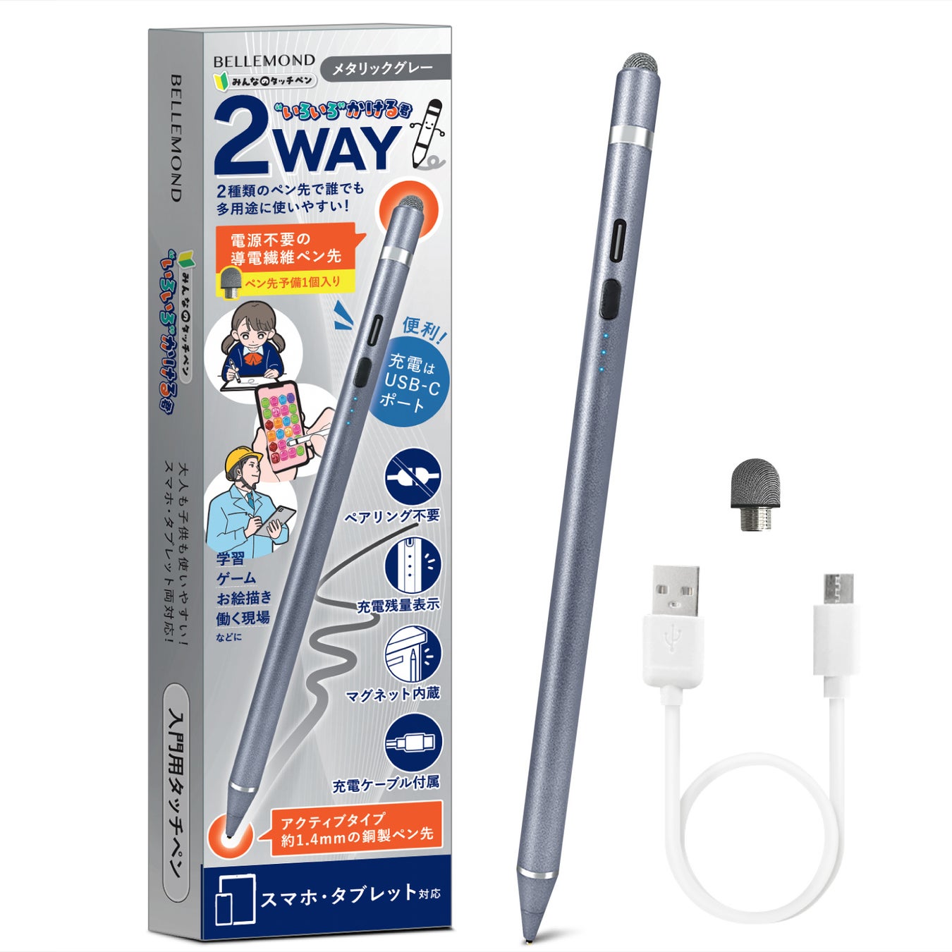 2WAYペン先:1.4mmの極細金属製ペン先(充電式)と導電繊維製ペン先(交換可能)を使い分け、手袋やネイルをしていても快適に操作可能。