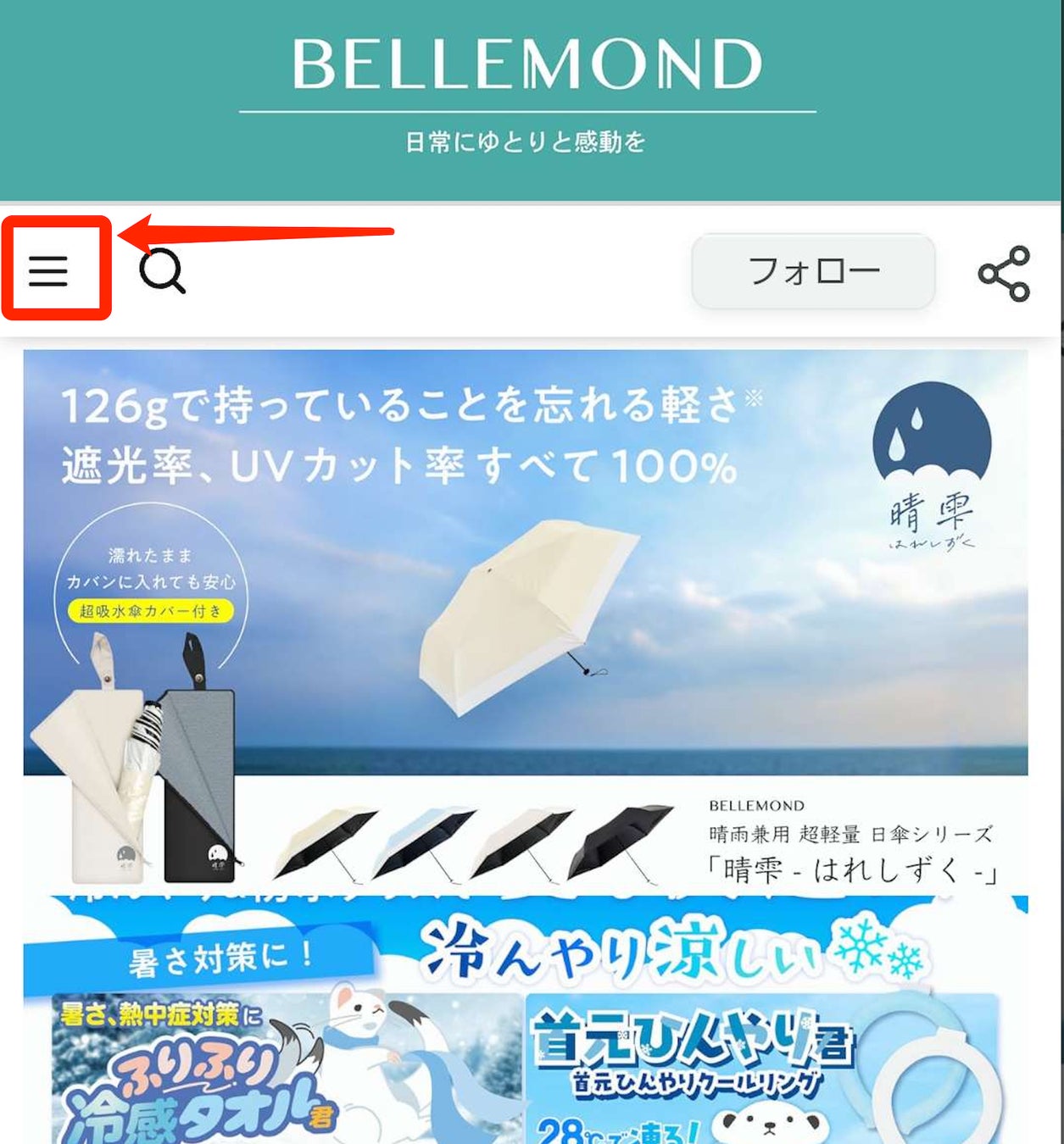 ①ベルモンドトップページにアクセスし、左上部の3本線カテゴリーをタップしてください。