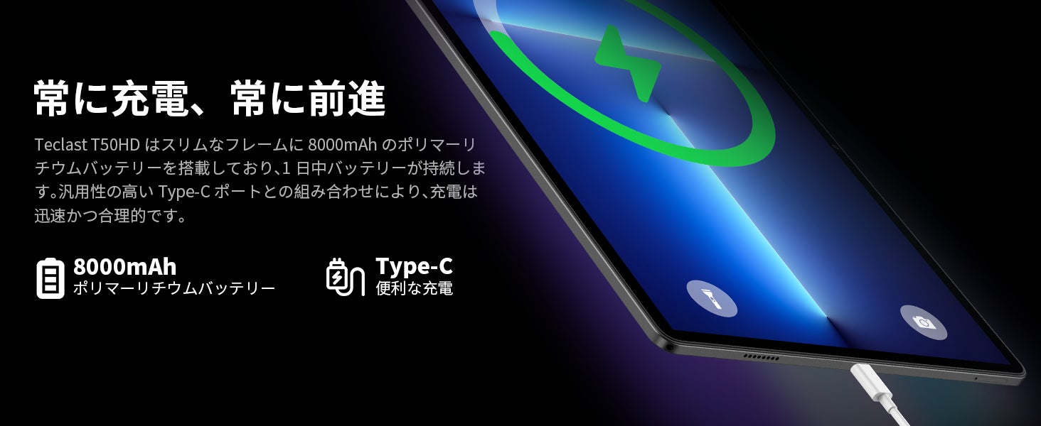スリムなフレームに8000mAhのポリマーリチウムバッテリーを搭載しており、1日中バッテリーが持続します。汎用性の高いType-Cポートとの組み合わせにより、充電は迅速かつ合理的です。
