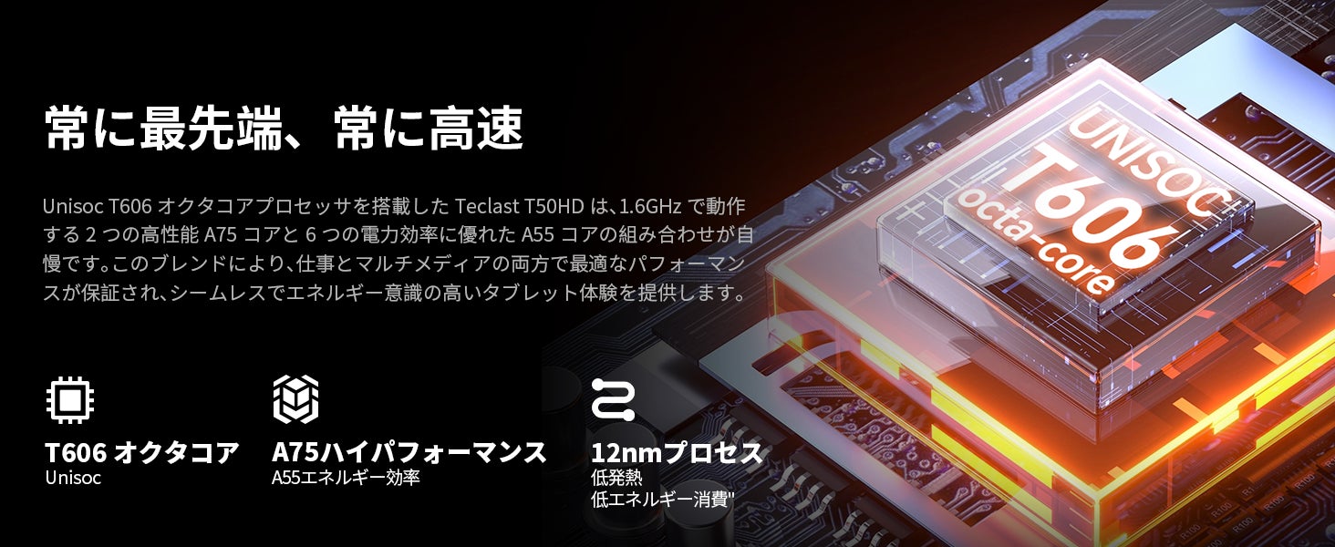 Unisoc T606オクタコアプロセッサを搭載したTeclast T50HDは、1.8GHzで動作する2つの高性能A75コアと6つの電力効率に優れたA55コアの組み合わせが自慢です。このブレンドにより、仕事とマルチメディアの両方で最適なパフォーマンスが保証され、シームレスでエネルギー意識の高いタブレット体験を提供します。