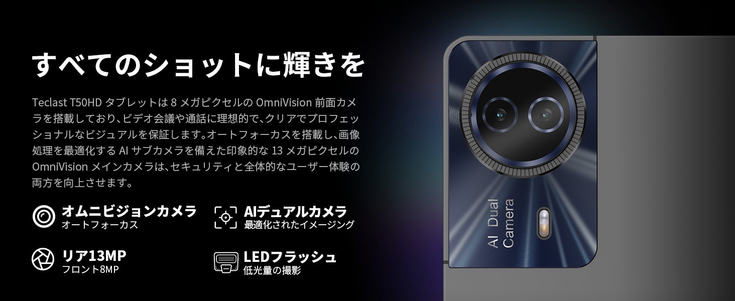 バックアッセンブリープロセスを採用したTeclast T50HDは、洗練されたユニボディデザインが特徴です。宇宙のエレメントからインスピレーションを得たオーラ・リングのデザインは、革新と美学の融合を象徴しています。鮮やかなテクスチャーで飾られたタブレットのカメラモジュールのデザインは、装飾的でダイナミックな表面を作り出し、その洗練された外観をさらに引き立てています。