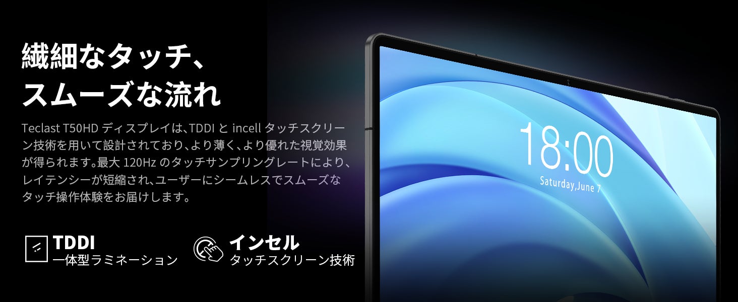 Teclast T50HDディスプレイは、TDDIとIncellタッチスクリーン技術を用いて設計されており、より薄く、より優れた視覚効果が得られます。最大120Hzのタッチサンプリングレートにより、レイテンシーが短縮され、ユーザーにシームレスでスムーズなタッチ操作体験をお届けします。
