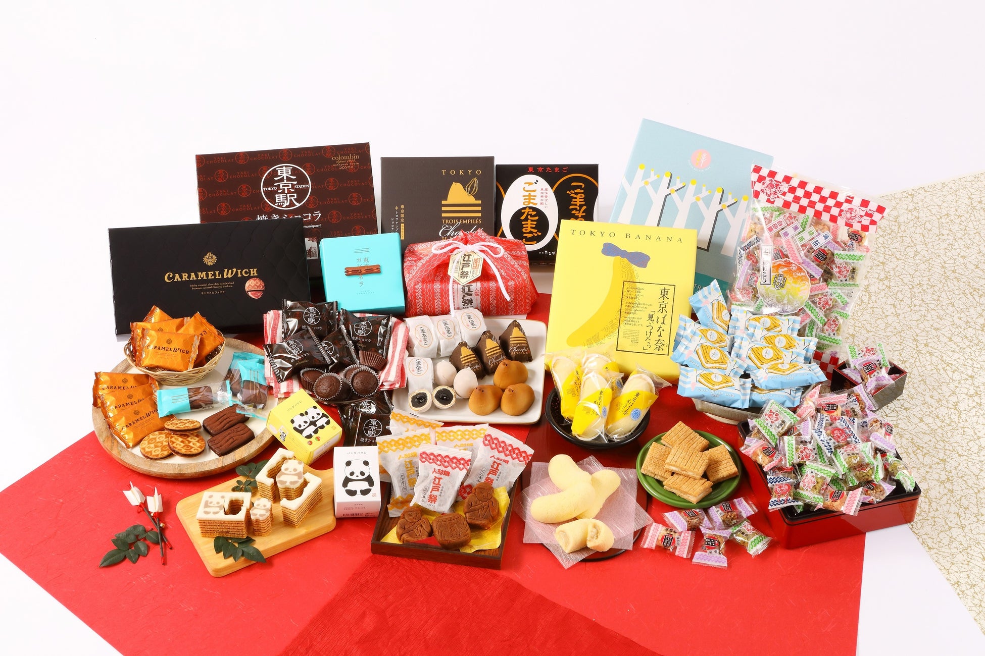 東京ばな奈「見ぃつけたっ」8個入、シュガーバターサンドの木7個入、鎌倉半月10枚入、トロワアンプレスショコラひよ子6個入、コロンバン東京駅焼きショコラ12個入、東京ぱりわさび14枚入、常盤堂雷おこし上磯部4種ミックス