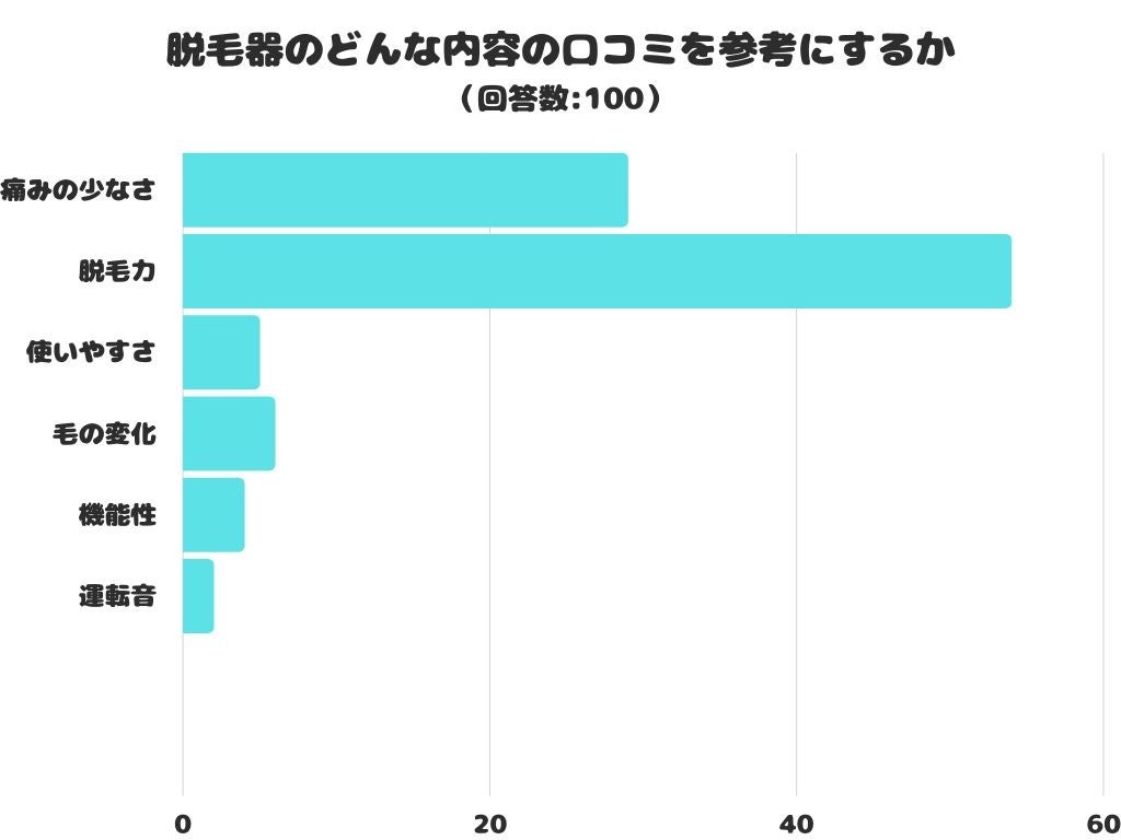 脱毛器のどんな内容の口コミを参考にするかをアンケートにて調査したところ、1位は「脱毛力」でした。
