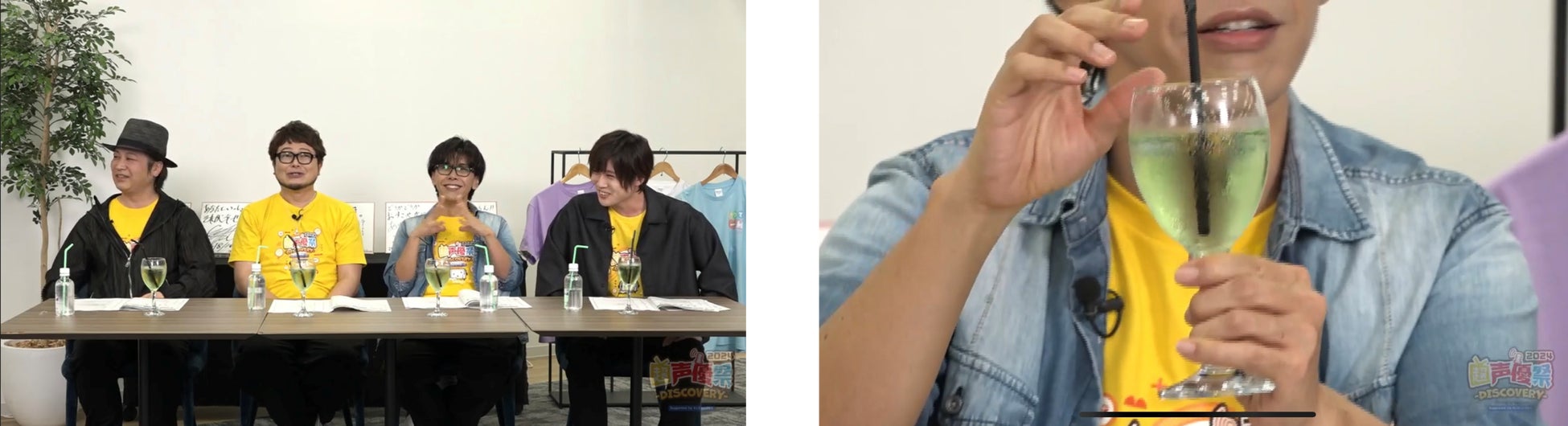 このまま次のコーナーへ行きたいところですが、ここで挨拶からフルパワーのゲストたちにクールダウンも兼ねて、番組特製の鮮やかな緑色のドリンクで一旦小休憩。実はこのドリンク、緑川のこだわりが詰まった逸品です。のどに良い成分を配合したハーブ風味のドリンクで、ゲストたちも「いい香り!」「爽やかで美味しい!」と目を輝かせます。興津が「このドリンクのおかげで喉が開いて、まろやかな声になりました!」と大音量の美声を響かせると、鳥海が「音声さん今日嫌だろうね!みんな急に音量を上げたりするから」とツッコみます。