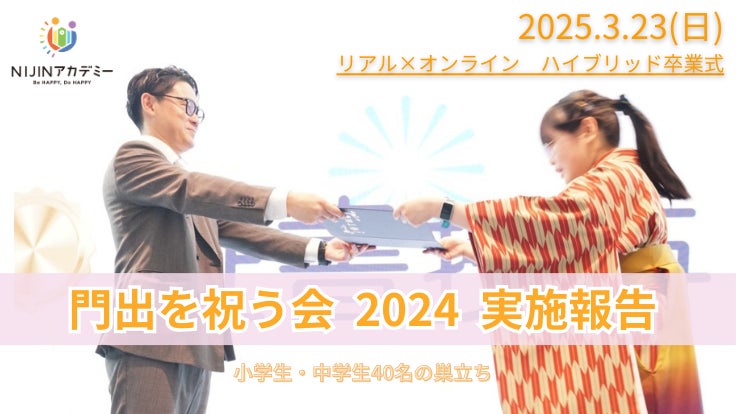 日本中の学校をハッピーにする株式会社NIJIN(本社:東京都江東区、代表取締役:星野達郎)が運営する小中学生向けオルタナティブスクール「NIJINアカデミー」は、2025年3月23日、二度目の卒業式となる”門出を祝う会”を対面とオンラインの同時開催し、小学6年生35名、中学3年生5名の計40名が新たな門出を迎え、総勢150名が参加しました。
