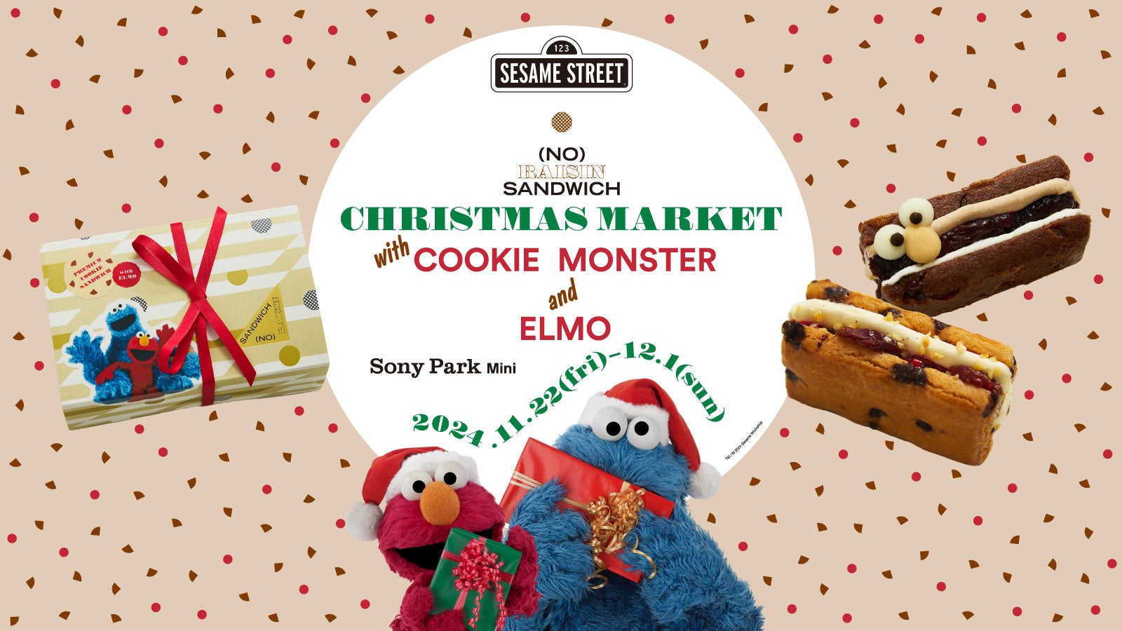 Sony Park Mini(ソニーパークミニ)は、フードエッセイスト・平野紗季子がプロデュースする菓子ブランド「(NO) RAISIN SANDWICH(ノー・レーズン・サンドイッチ)」と、世界中で愛されている「セサミストリート」とのコラボレーションによるPOP-UP ショップの第2弾「(NO) RAISIN SANDWICH CHRISTMAS MARKET with COOKIE MONSTER and ELMO」を、11月22日(金)~12月1日(日)の10日間限定でオープンします。