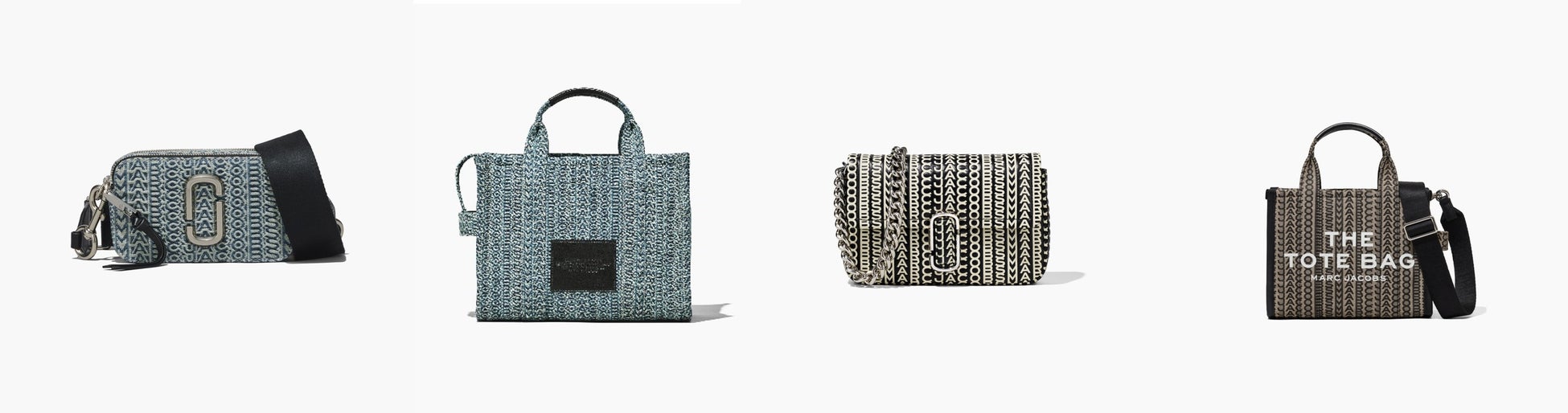 左から、ザ モノグラム サンフェード デニム スナップショット ¥62,700/ ザ モノグラム サンフェード デニム トートバッグ ミディアム ¥56,100/ ザ モノグラム レザー J マーク ショルダーバッグ ¥74,800円/ ザ モノグラム ジャカード トート バッグ スモール ¥47,300 全て税込価格